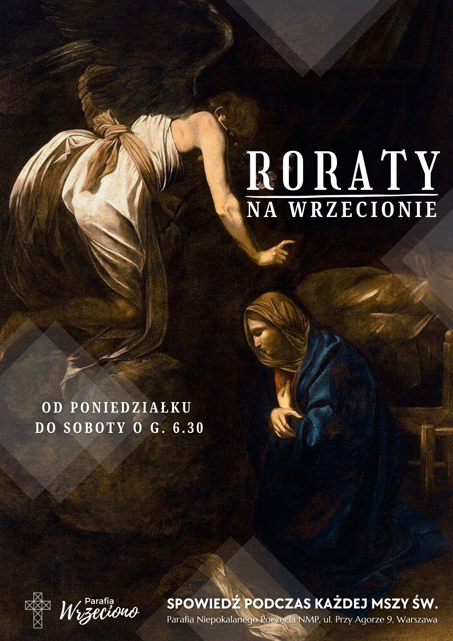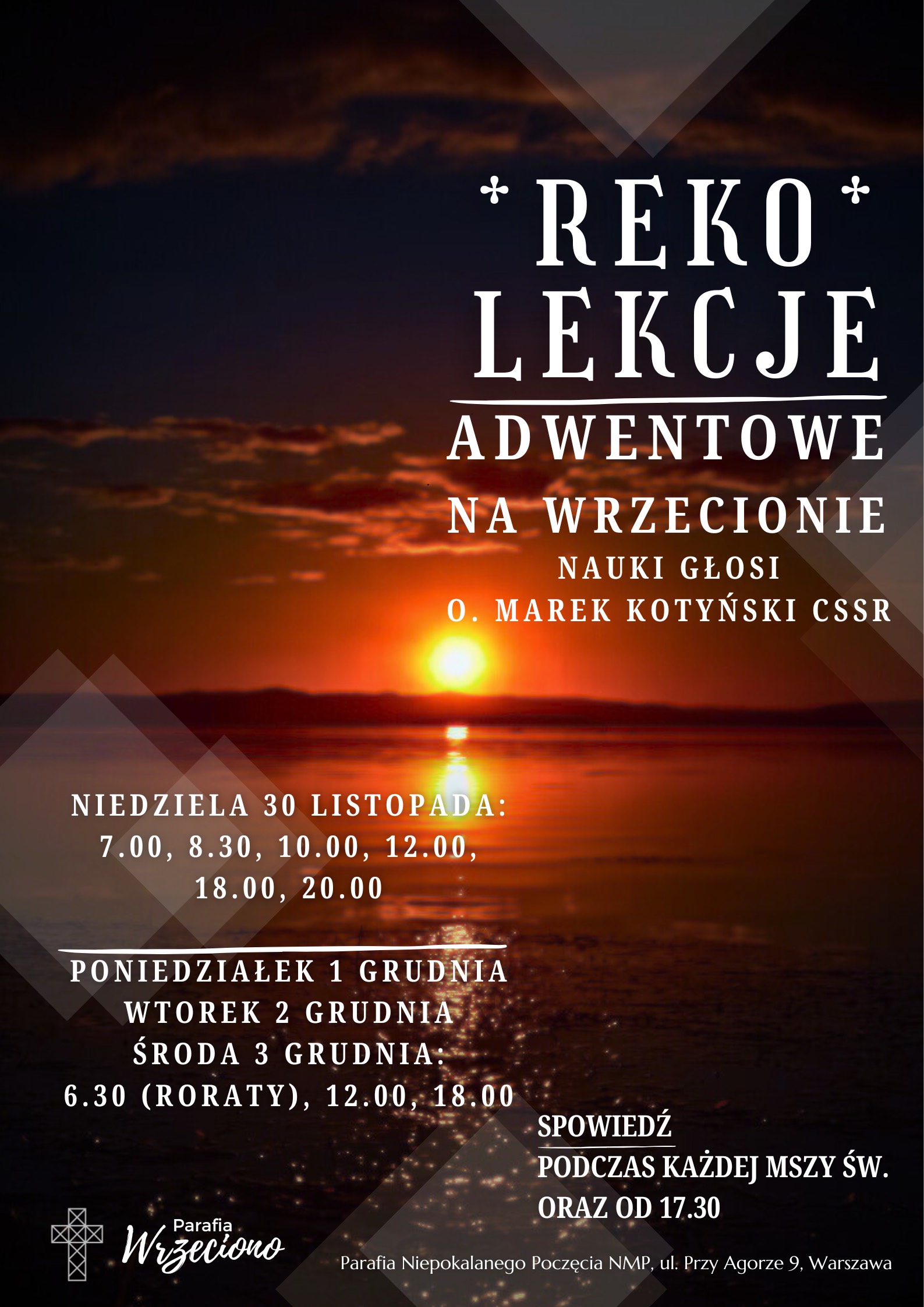 Poniedziałek, 1 grudnia, wtorek, 2 grudnia i środa, 3 grudnia: 6.30 (roraty), 12.00, 18.00.