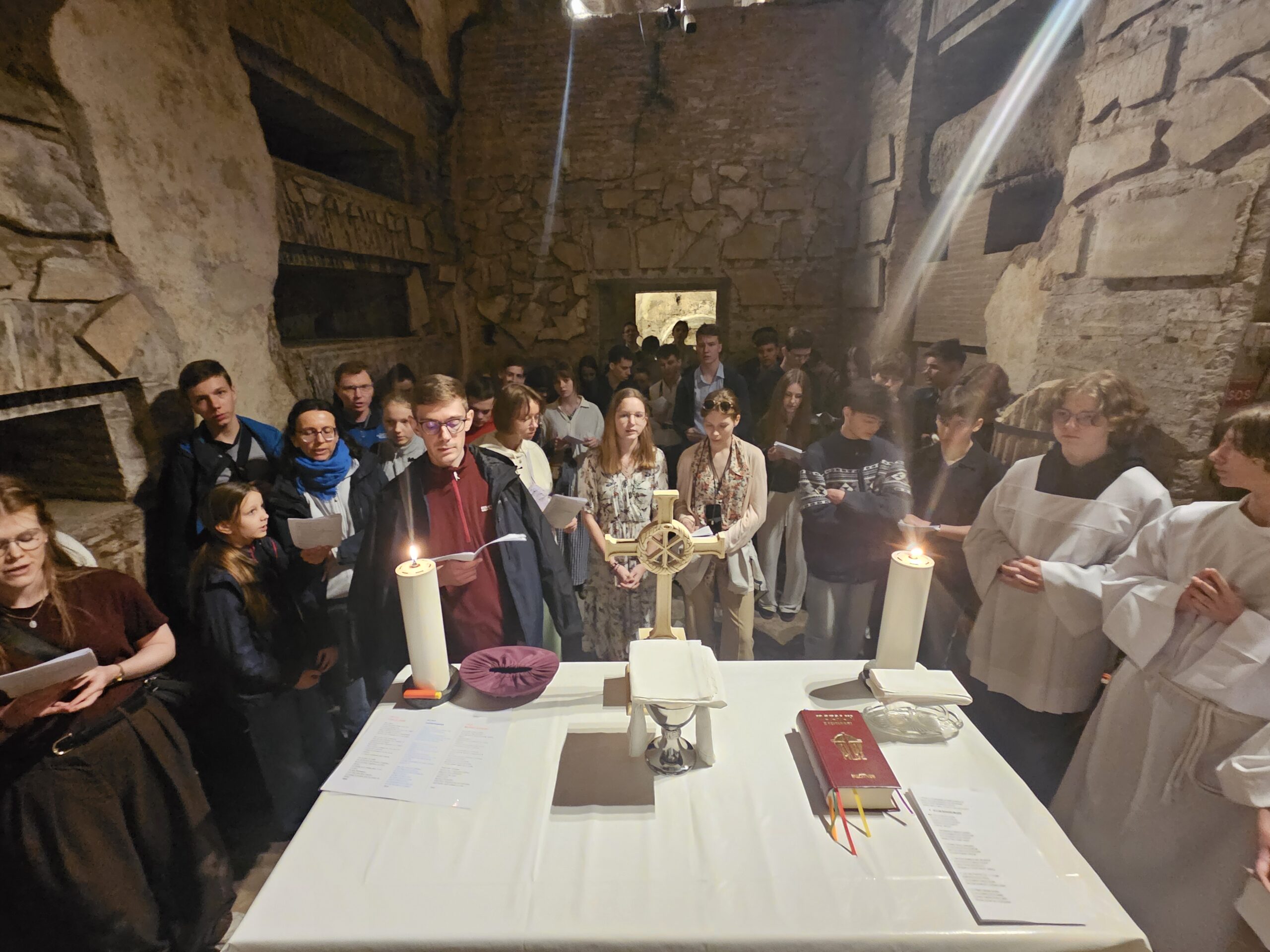 Czwartek rozpoczynamy od starożytnej Via Appia Antica w kościele Quo vadis, gdzie Pan Jezus rozmawiał ze św. Piotrem. „A czy ja sam idę za Jezusem?” – pytamy się. Niedługo później schodzimy już kilkanaście metrów pod ziemię, aby przeciskać się wąskimi korytarzami Katakumb Świętego Kaliksta. To robi ogromne wrażenie, tu pochowanych jest tysiące ludzi z przed 2000 lat, tysiące pierwszych chrześcijan, setki znanych męczenników. Odprawiamy Mszę Świętą w krypcie grobowej świętego papieża Gajusa, który zmarł 1730 lat temu! Znowu na powierzchni zostajemy przyjęci w kaplicy salezjanów, gdzie znajdują się relikwie świętego Tarsycjusza, ministranta zabitego za wiarę w 250 roku. Salezjanie częstują nas tradycyjnym włoskim pranzo z makaronem.