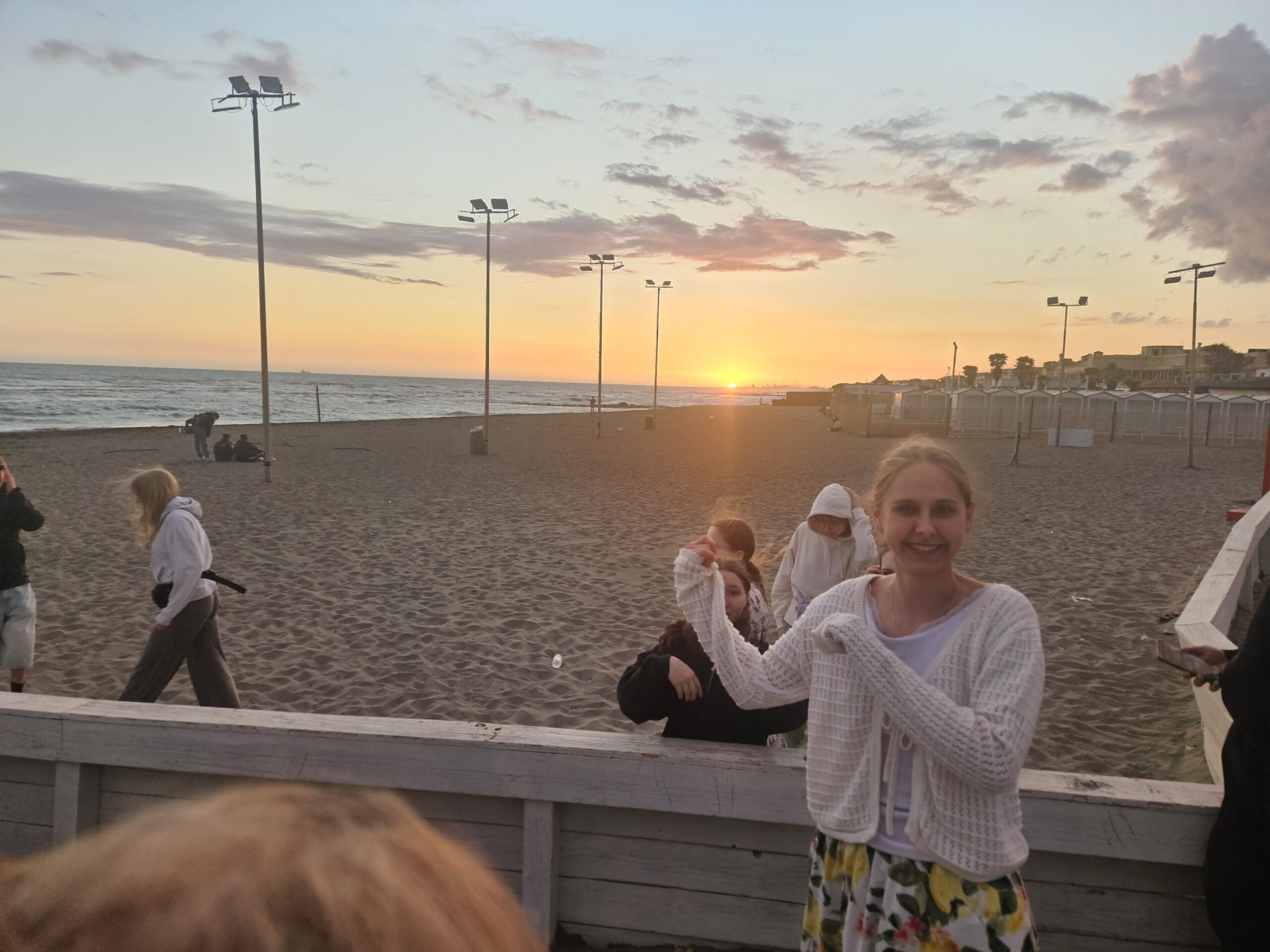 Ostia to kurort nad Morzem Śródziemnym, więc skorzystaliśmy z okazji do kąpieli w zimnej jeszcze wodzie i tradycyjnej kwadratowej pizzy na kawałki. Piękny był widok pięknej tęczy i zachodzącego w morzu słońca. Z wakacyjnego zapomnienia wybudził nas przelatujący nad nami wojskowy Hercules, z samochodami dla amerykańskiego prezydenta.