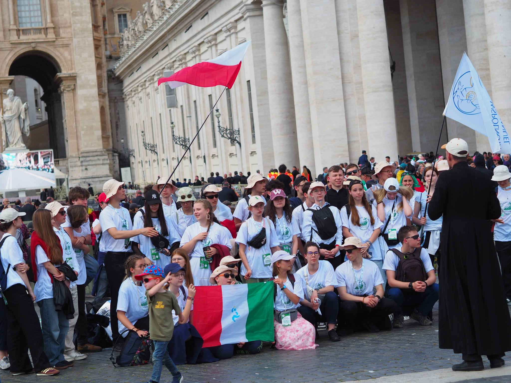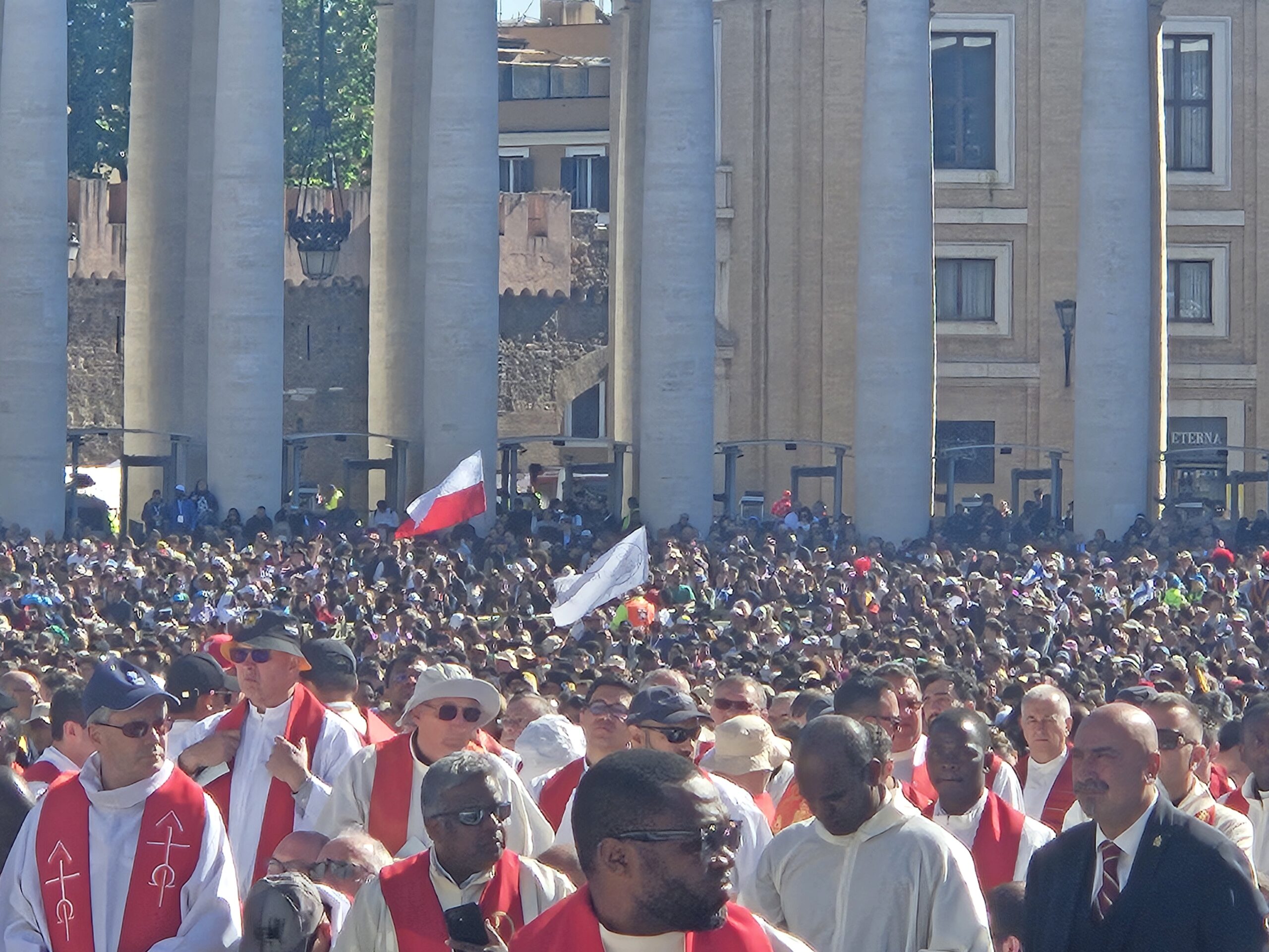Big Day! Sobotę zaczęliśmy o 4-tej rano. Złapaliśmy autobus nocny i pierwszym pociągiem metra dotarliśmy do Watykanu. Po 6-tej przechodziliśmy kolejne kontrole bezpieczeństwa i dotarliśmy na zapełniający się Plac Świętego Piotra. Miejsce było idealne, blisko ołtarza i wszystko widać. Do rozpoczęcia liturgii nasze flagi Polski i Wspólnoty Emmanuel powiewały wysoko nad zgromadzonymi wiernymi.