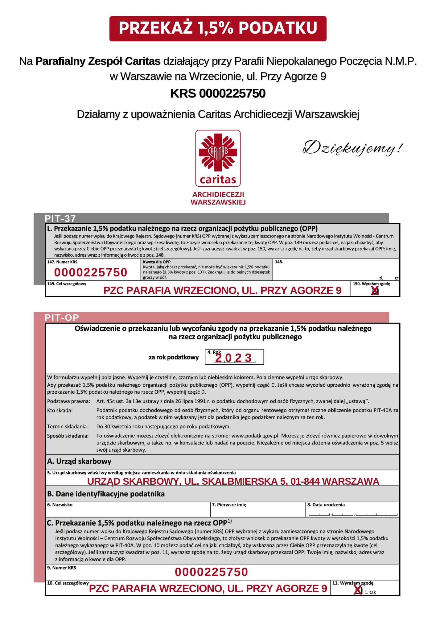 (Numer KRS – 0000225750, cel szczegółowy – PZC Parafia Wrzeciono, ul. Przy Agorze 9).