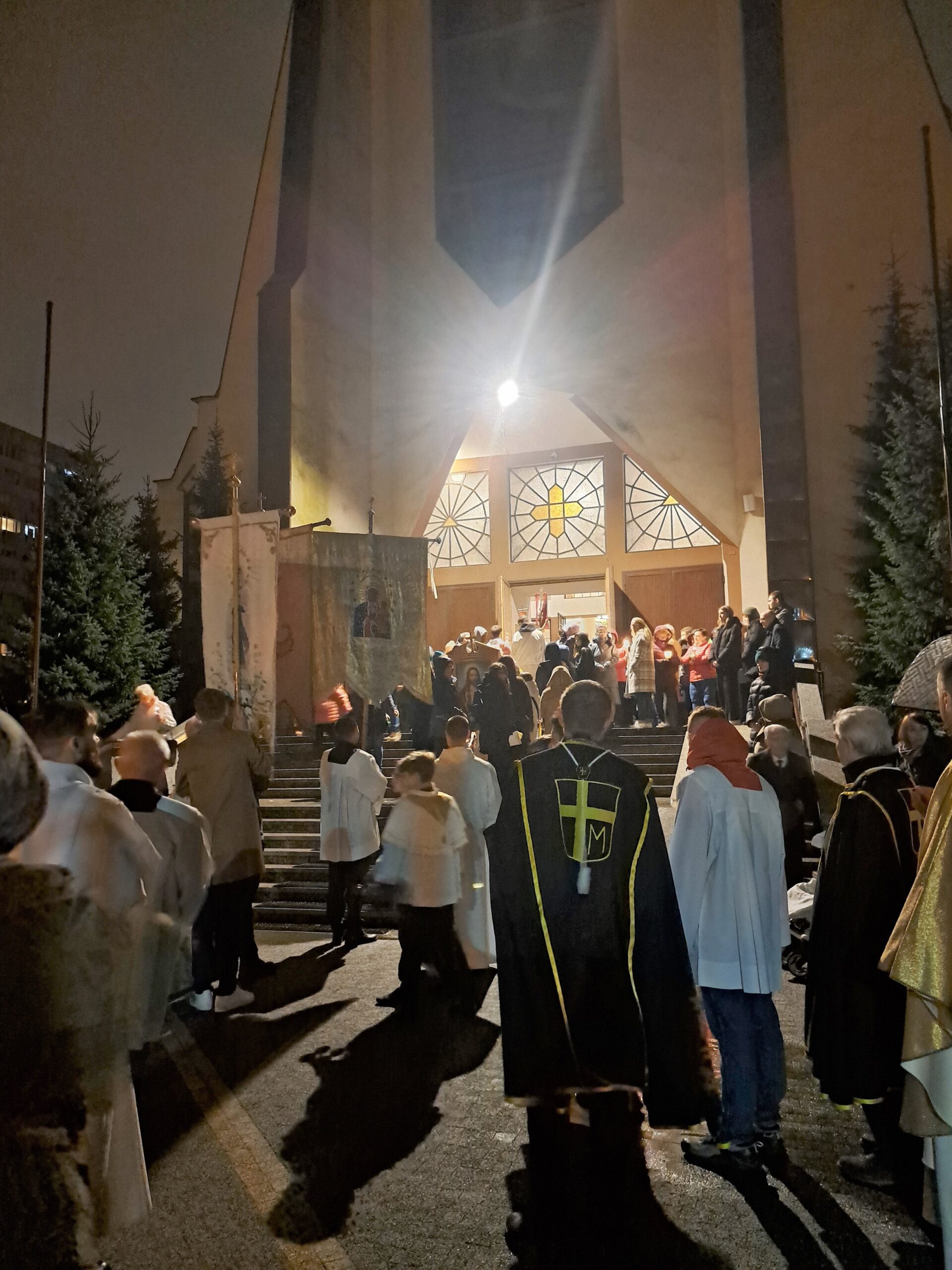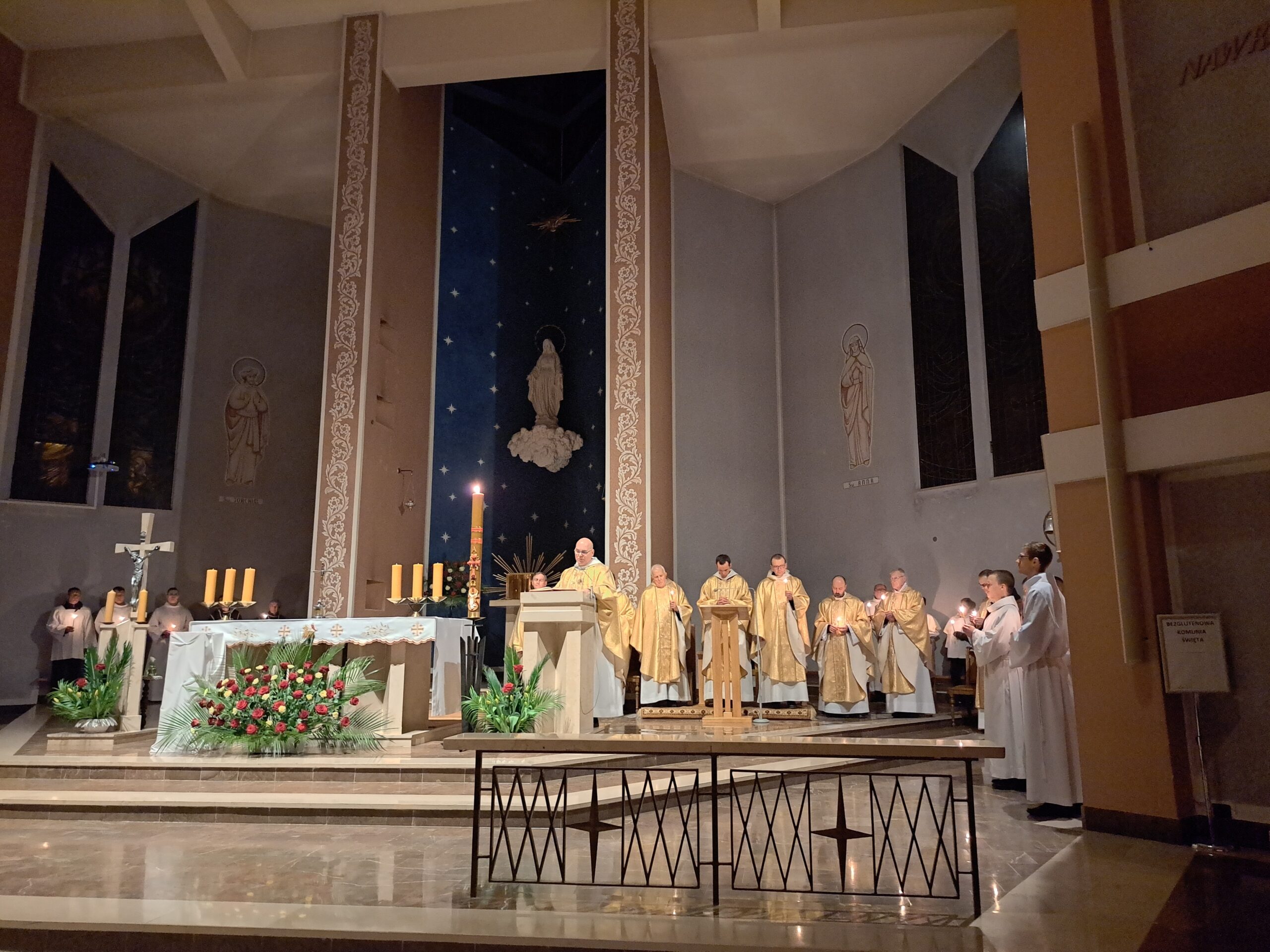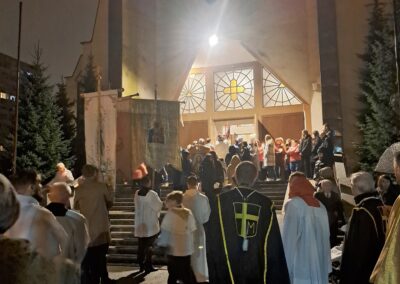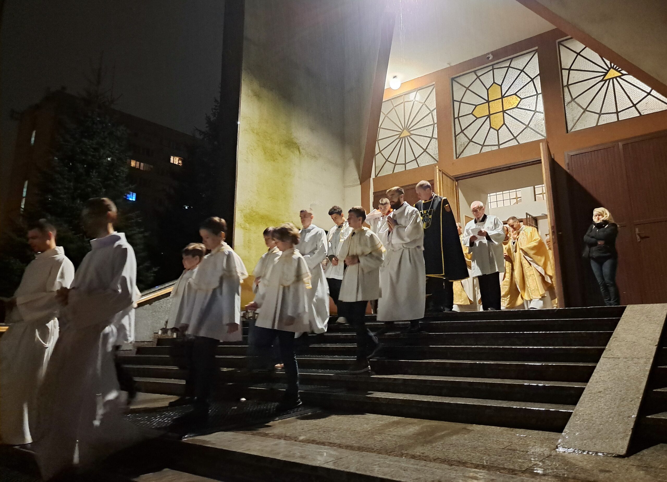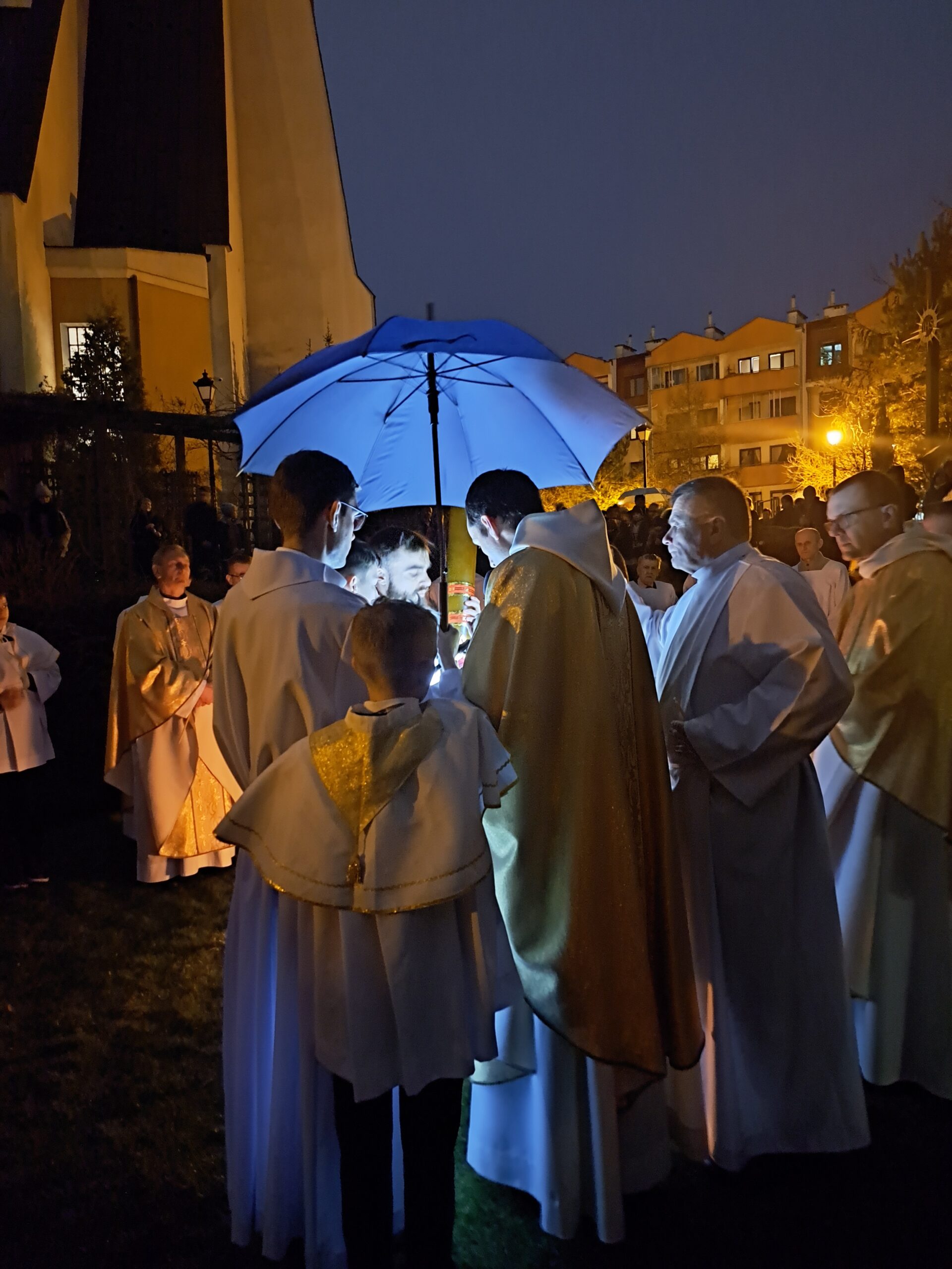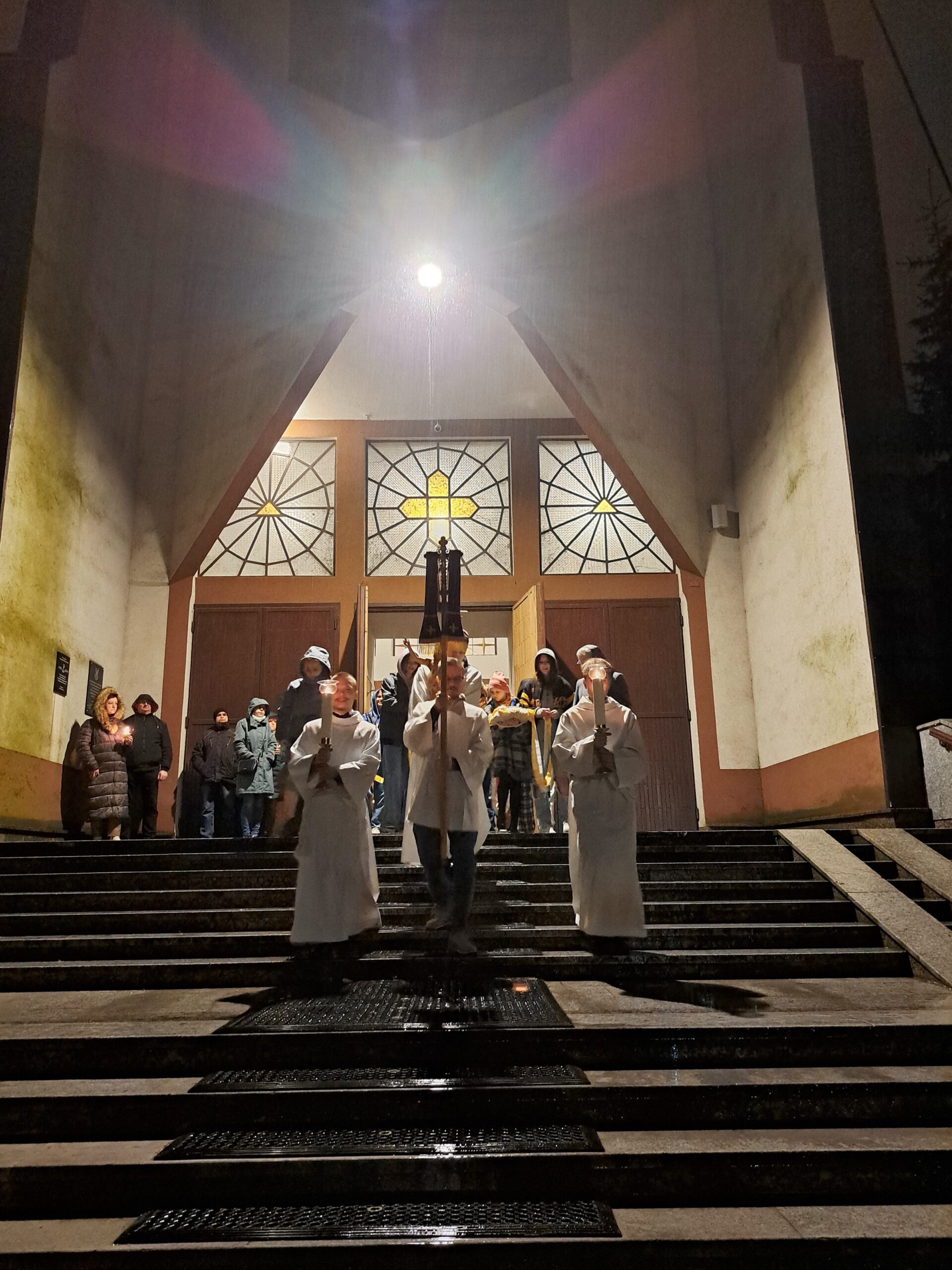 Liturgia Wigilii Paschalnej rozpoczęła się o godz. 20.00 obrzędem światła, czyli poświęceniem ognia w parafialnym ogrodzie. Liturgii przewodniczył ks. Mikołaj Dobosz, który po zapaleniu Paschału, uroczyście wniósł go do kościoła z trzykrotnym oznajmieniem: Światło Chrystusa. Wierni zapalając świece od Paschału wypełnili kościół Jego blaskiem. Szczególnie bogata w tym dniu Liturgia Słowa przypomniała o najważniejszych momentach historii zbawienia. Po uroczystym odśpiewaniu Chwała na wysokości Bogu, wysłuchaliśmy Ewangelii o odkryciu przez niewiasty pustego grobu Chrystusa. Po homilii miało miejsce poświęcenie wody chrzcielnej, poprzez zanurzenie Paschału, który uroczystą procesją został przyniesiony do chrzcielnicy. Wierni, ponownie otoczeni Światłem Chrystusa, mogli odnowić przyrzeczenia Sakramentu Chrztu Świętego. Chór parafialny wzbogacił całą Liturgię uroczystym śpiewem pieśni głoszących Zmartwychwstanie. Ostatnim elementem Liturgii była procesja Zmartwychwstania, dzięki której Dobra Nowina niosła się po całej okolicy przez śpiew wiernych – Alleluja!