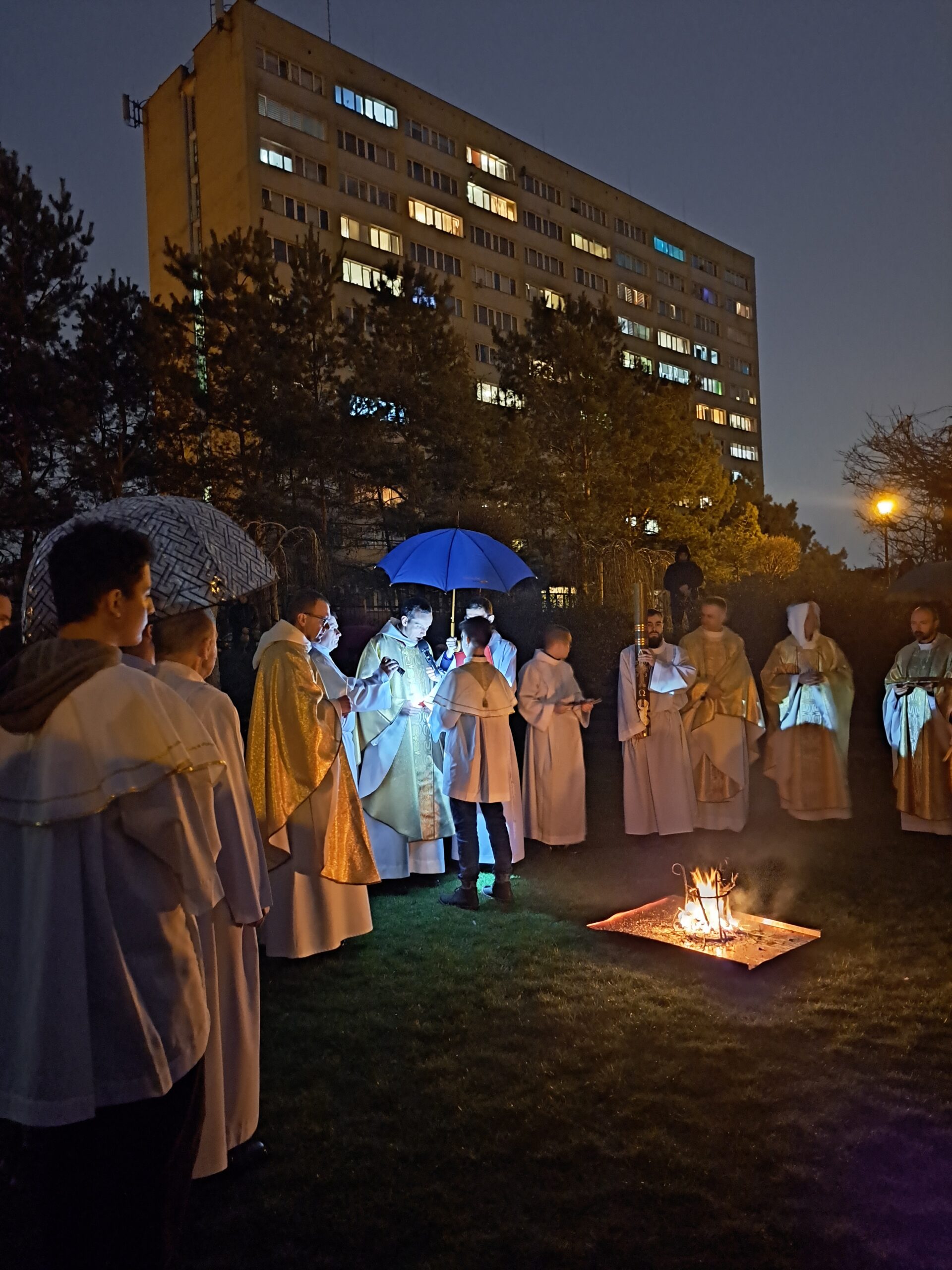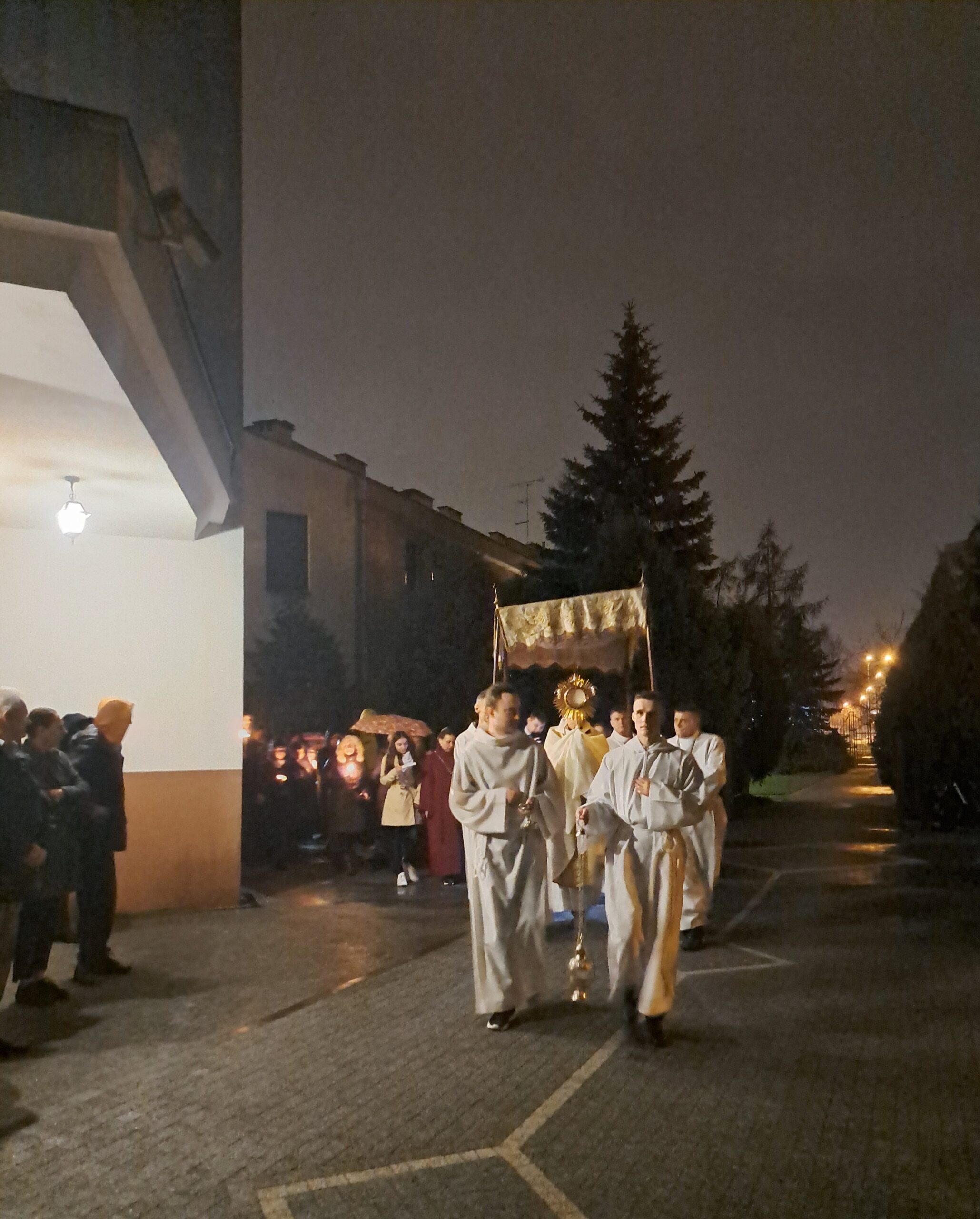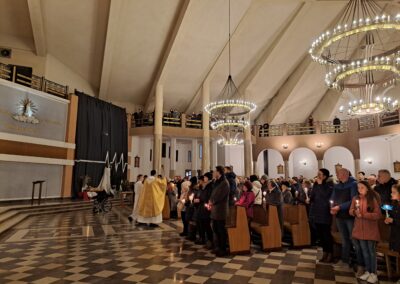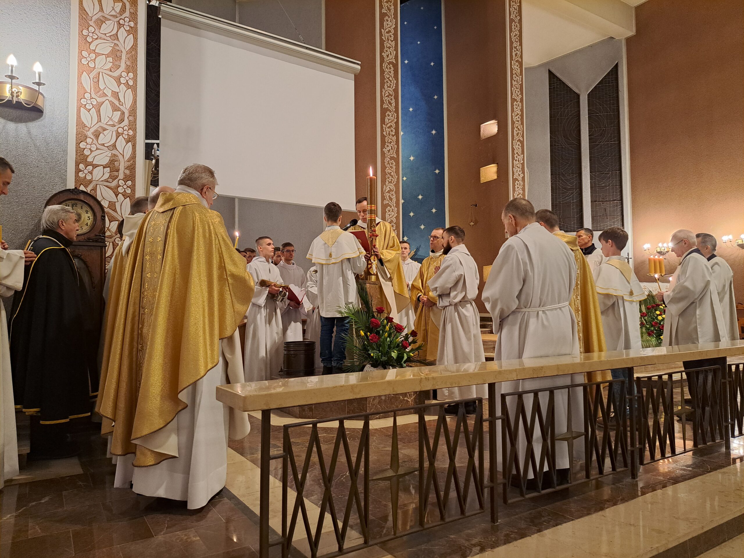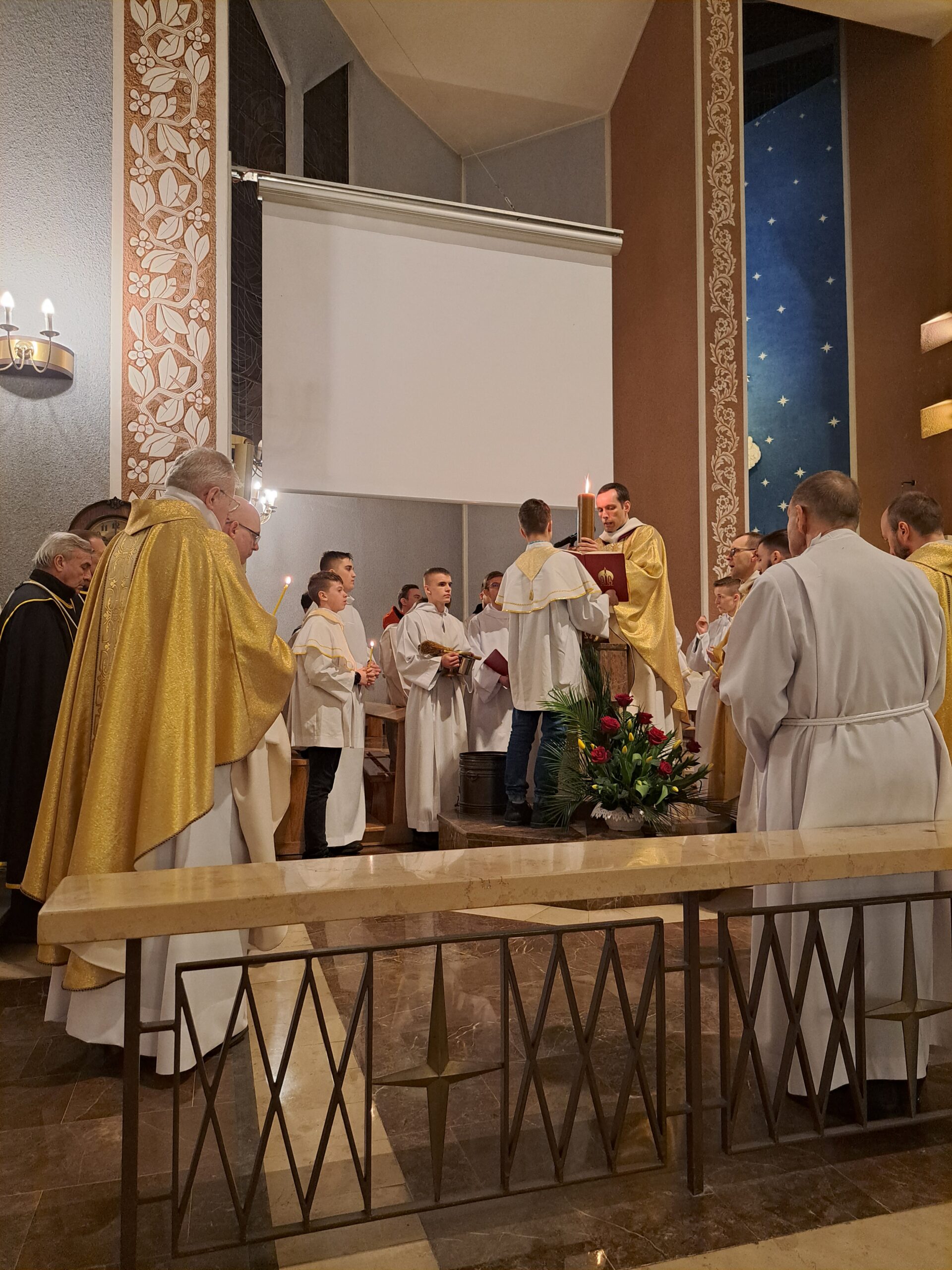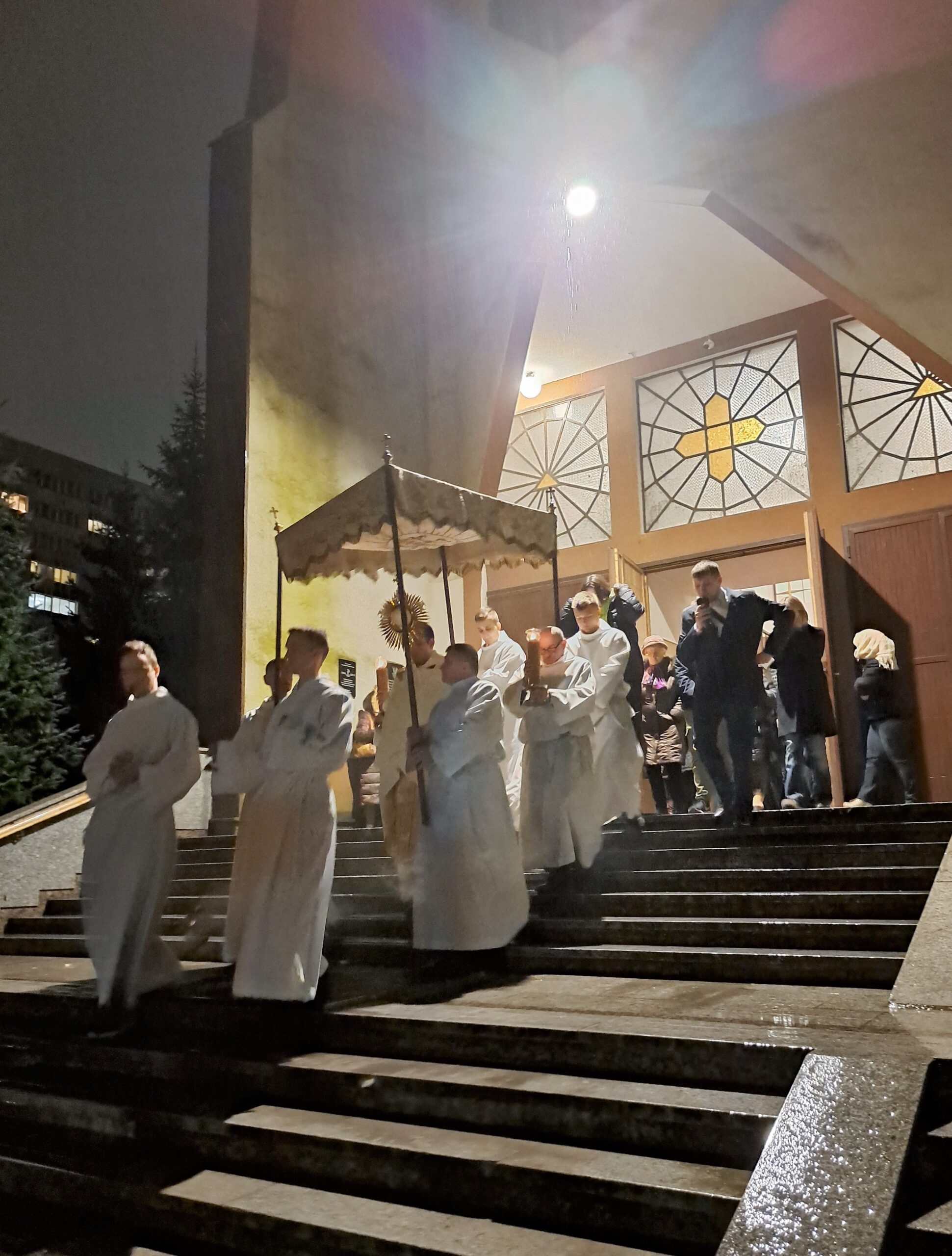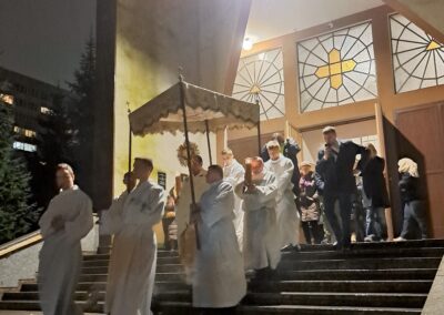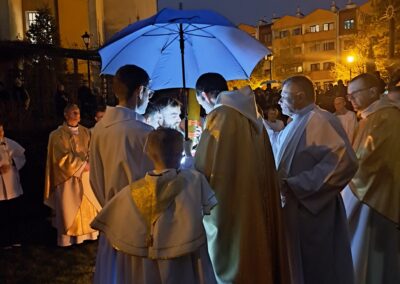 Liturgia Wigilii Paschalnej rozpoczęła się o godz. 20.00 obrzędem światła, czyli poświęceniem ognia w parafialnym ogrodzie. Liturgii przewodniczył ks. Mikołaj Dobosz, który po zapaleniu Paschału, uroczyście wniósł go do kościoła z trzykrotnym oznajmieniem: Światło Chrystusa. Wierni zapalając świece od Paschału wypełnili kościół Jego blaskiem. Szczególnie bogata w tym dniu Liturgia Słowa przypomniała o najważniejszych momentach historii zbawienia. Po uroczystym odśpiewaniu Chwała na wysokości Bogu, wysłuchaliśmy Ewangelii o odkryciu przez niewiasty pustego grobu Chrystusa. Po homilii miało miejsce poświęcenie wody chrzcielnej, poprzez zanurzenie Paschału, który uroczystą procesją został przyniesiony do chrzcielnicy. Wierni, ponownie otoczeni Światłem Chrystusa, mogli odnowić przyrzeczenia Sakramentu Chrztu Świętego. Chór parafialny wzbogacił całą Liturgię uroczystym śpiewem pieśni głoszących Zmartwychwstanie. Ostatnim elementem Liturgii była procesja Zmartwychwstania, dzięki której Dobra Nowina niosła się po całej okolicy przez śpiew wiernych – Alleluja!