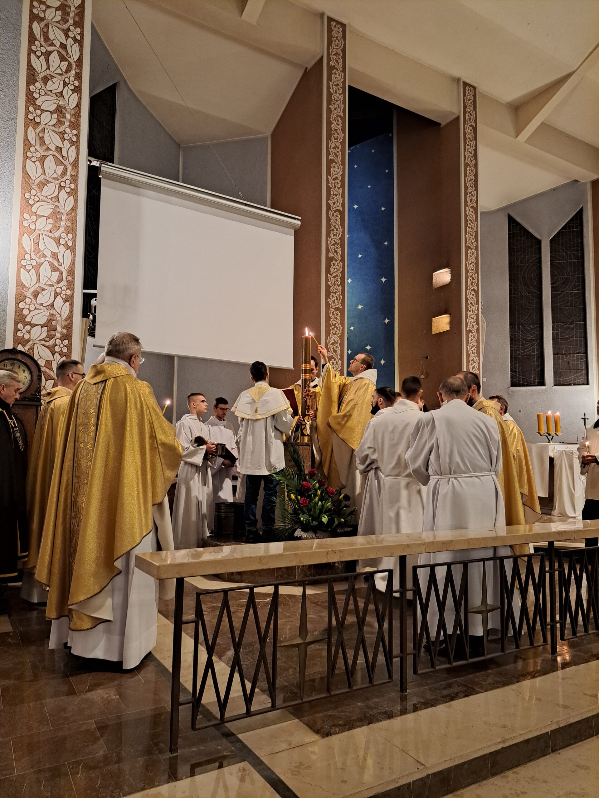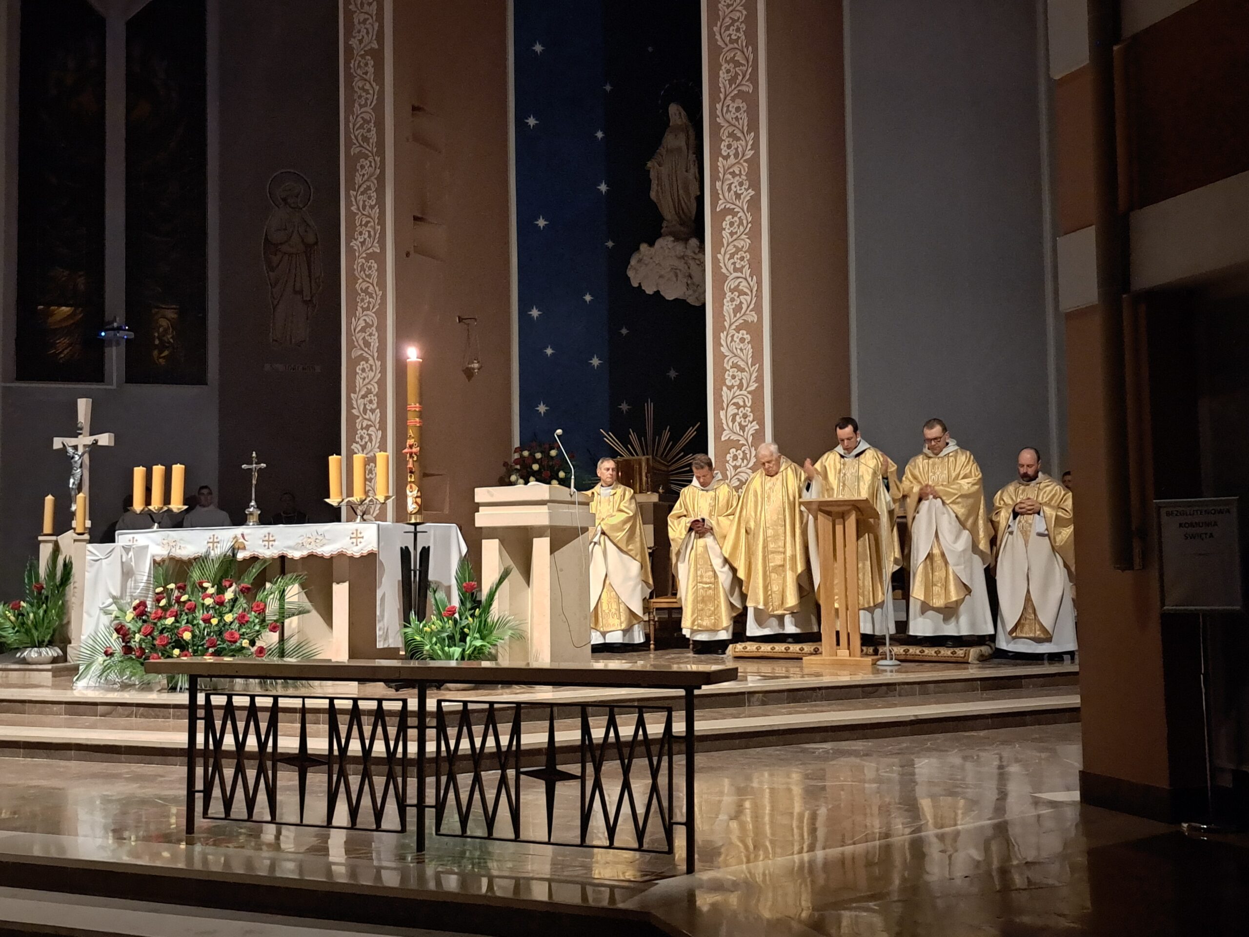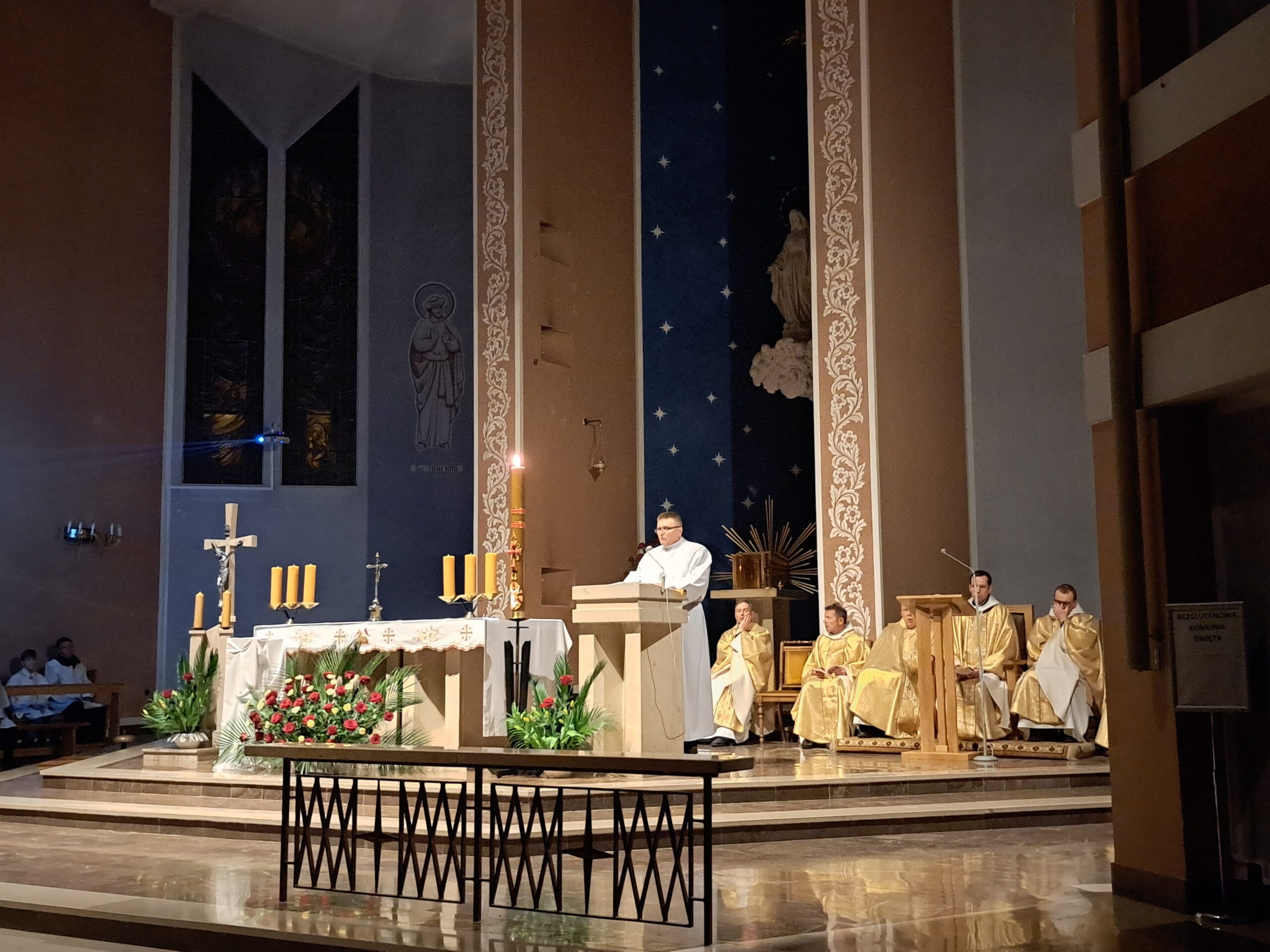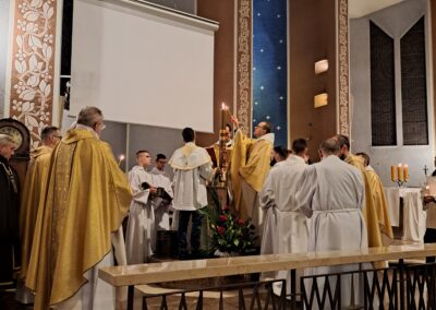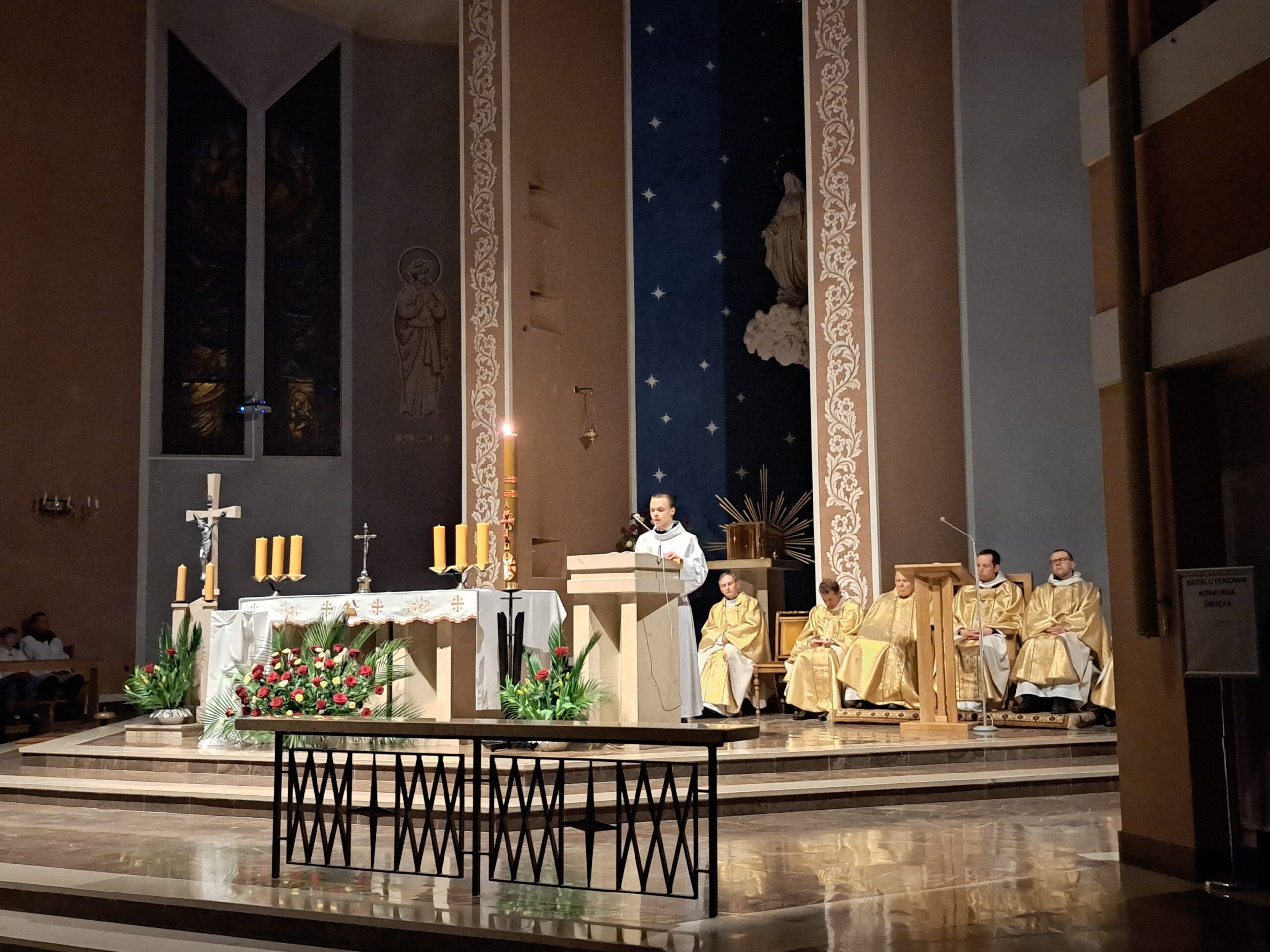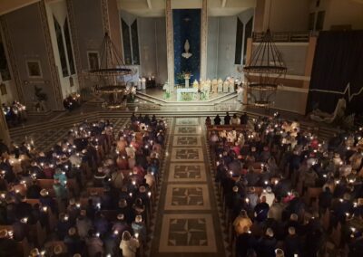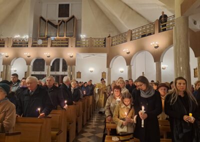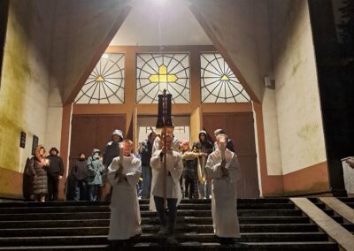 Liturgia Wigilii Paschalnej rozpoczęła się o godz. 20.00 obrzędem światła, czyli poświęceniem ognia w parafialnym ogrodzie. Liturgii przewodniczył ks. Mikołaj Dobosz, który po zapaleniu Paschału, uroczyście wniósł go do kościoła z trzykrotnym oznajmieniem: Światło Chrystusa. Wierni zapalając świece od Paschału wypełnili kościół Jego blaskiem. Szczególnie bogata w tym dniu Liturgia Słowa przypomniała o najważniejszych momentach historii zbawienia. Po uroczystym odśpiewaniu Chwała na wysokości Bogu, wysłuchaliśmy Ewangelii o odkryciu przez niewiasty pustego grobu Chrystusa. Po homilii miało miejsce poświęcenie wody chrzcielnej, poprzez zanurzenie Paschału, który uroczystą procesją został przyniesiony do chrzcielnicy. Wierni, ponownie otoczeni Światłem Chrystusa, mogli odnowić przyrzeczenia Sakramentu Chrztu Świętego. Chór parafialny wzbogacił całą Liturgię uroczystym śpiewem pieśni głoszących Zmartwychwstanie. Ostatnim elementem Liturgii była procesja Zmartwychwstania, dzięki której Dobra Nowina niosła się po całej okolicy przez śpiew wiernych – Alleluja!