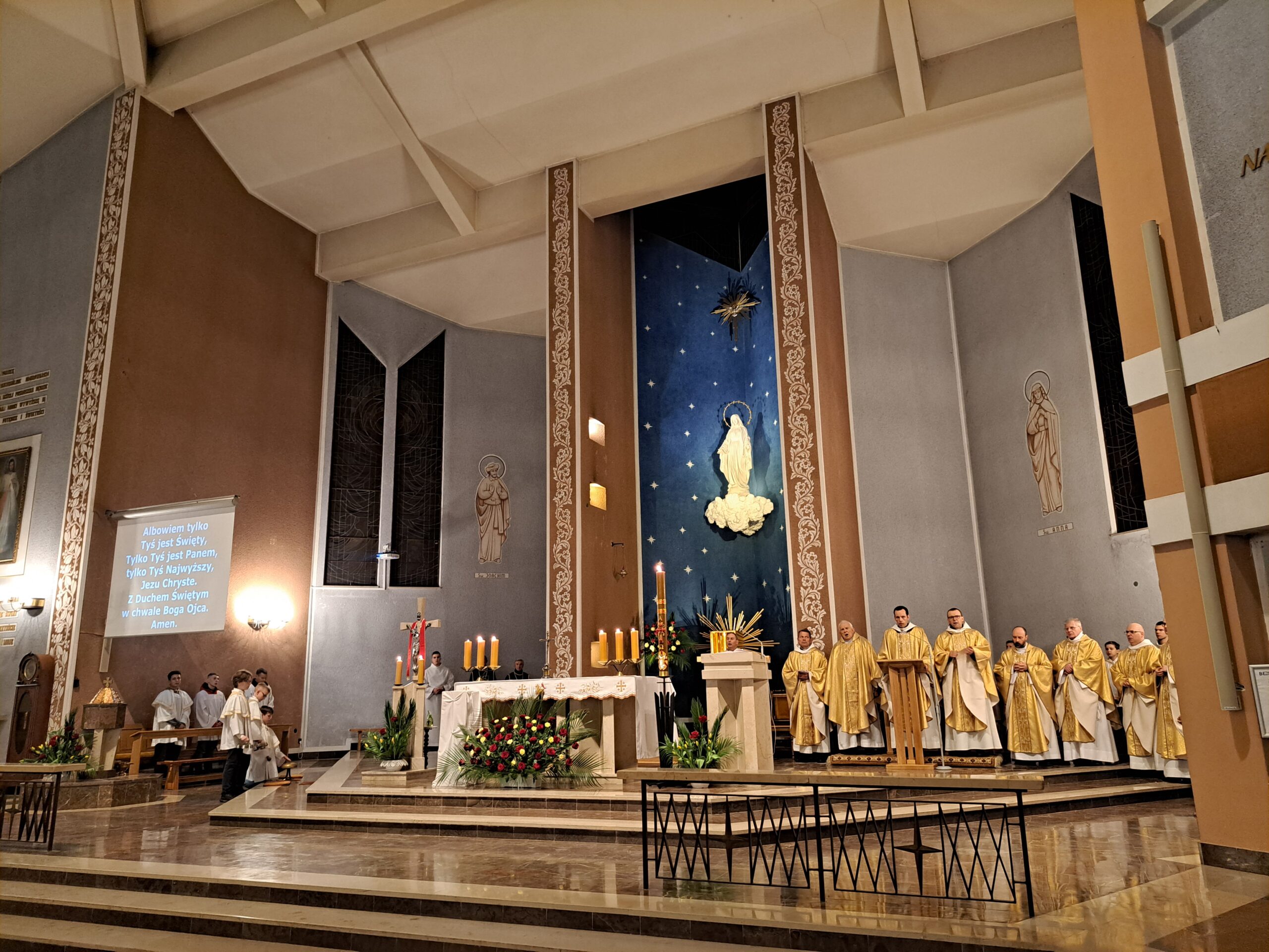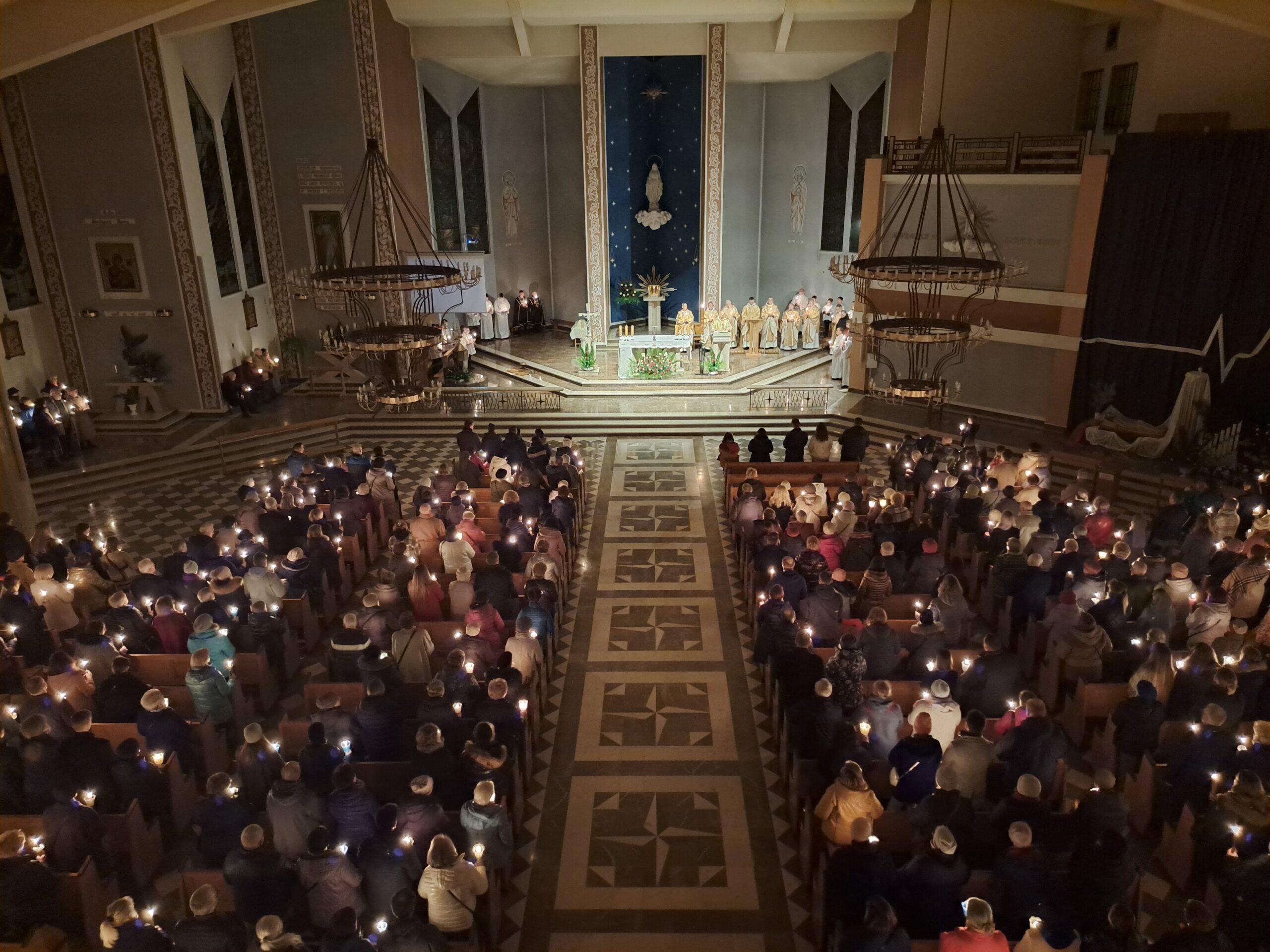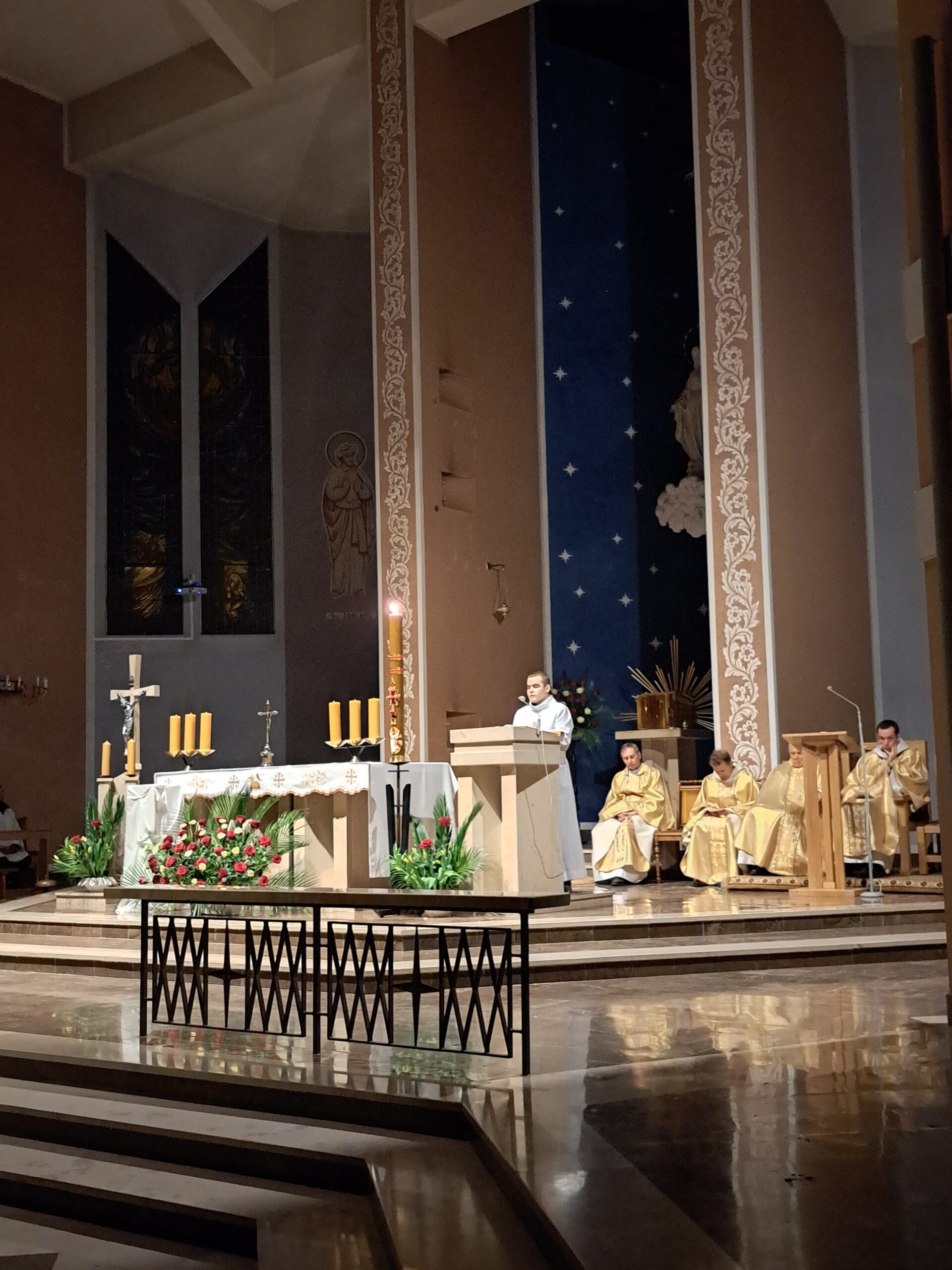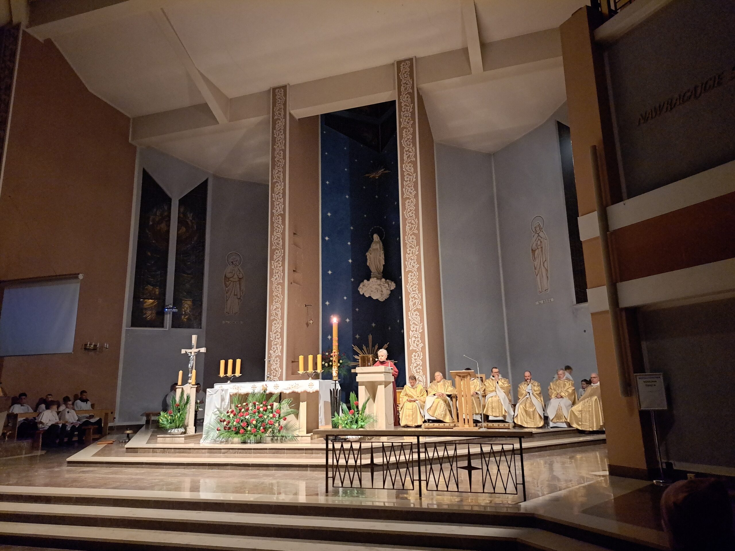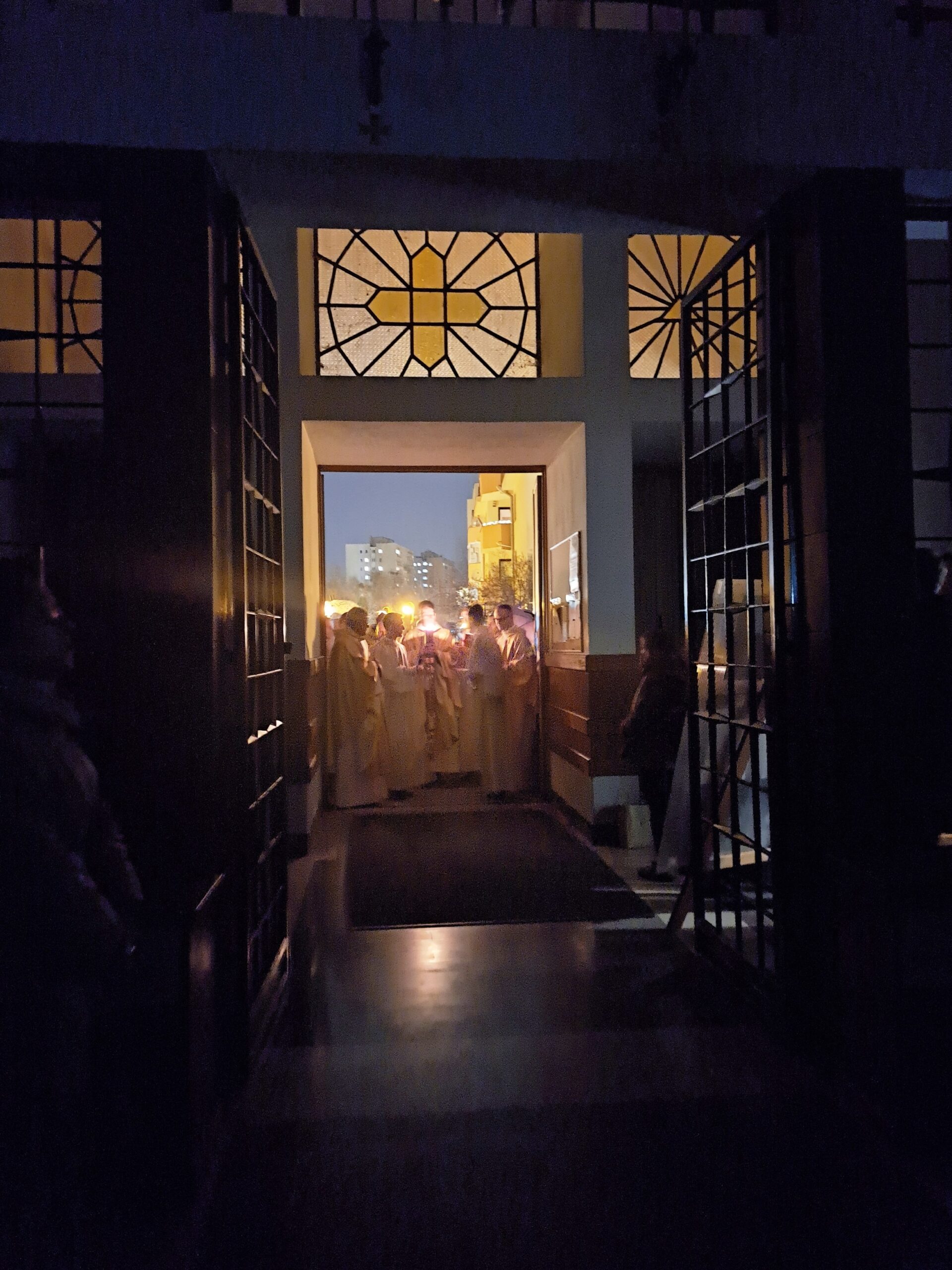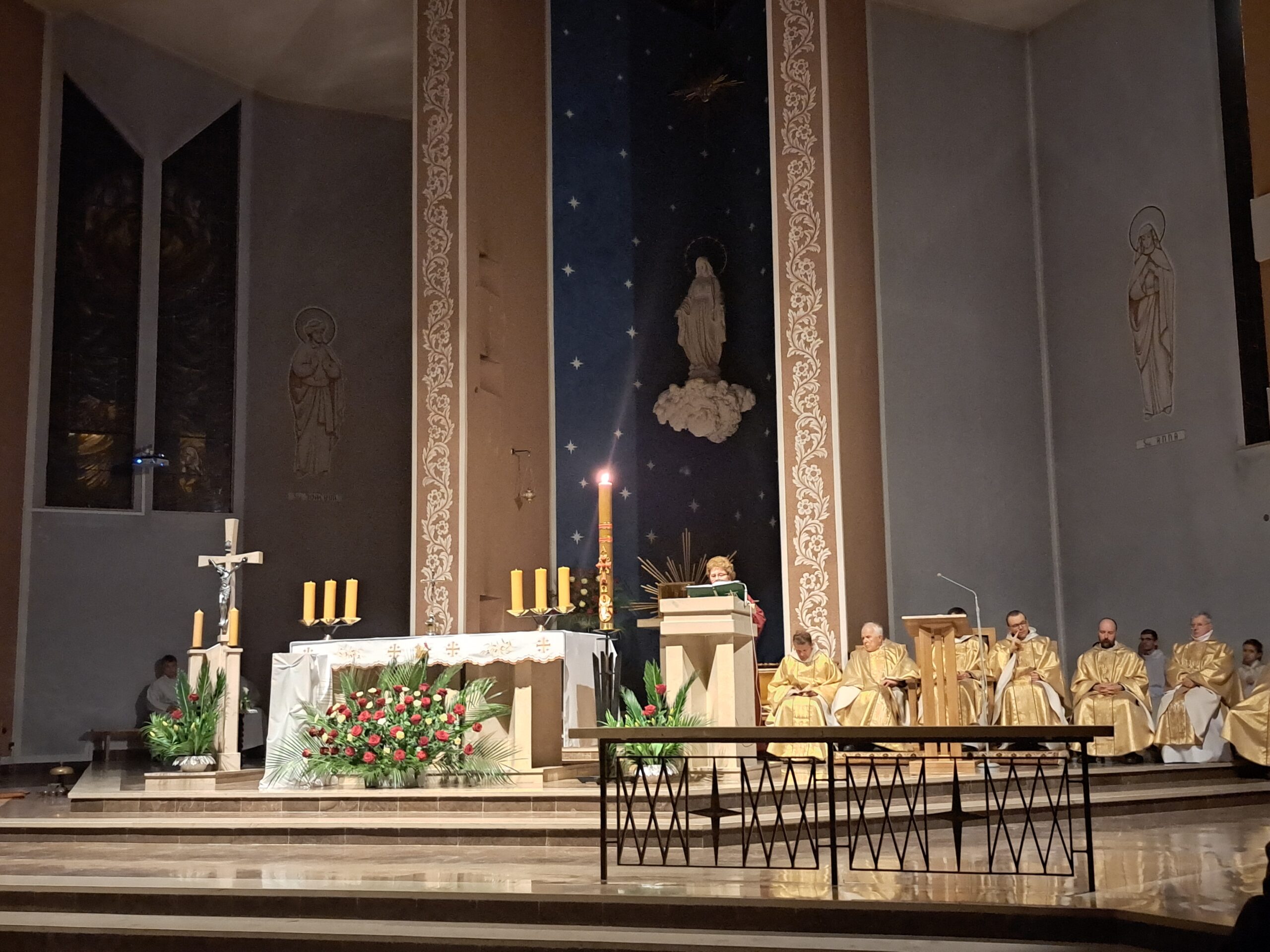 Liturgia Wigilii Paschalnej rozpoczęła się o godz. 20.00 obrzędem światła, czyli poświęceniem ognia w parafialnym ogrodzie. Liturgii przewodniczył ks. Mikołaj Dobosz, który po zapaleniu Paschału, uroczyście wniósł go do kościoła z trzykrotnym oznajmieniem: Światło Chrystusa. Wierni zapalając świece od Paschału wypełnili kościół Jego blaskiem. Szczególnie bogata w tym dniu Liturgia Słowa przypomniała o najważniejszych momentach historii zbawienia. Po uroczystym odśpiewaniu Chwała na wysokości Bogu, wysłuchaliśmy Ewangelii o odkryciu przez niewiasty pustego grobu Chrystusa. Po homilii miało miejsce poświęcenie wody chrzcielnej, poprzez zanurzenie Paschału, który uroczystą procesją został przyniesiony do chrzcielnicy. Wierni, ponownie otoczeni Światłem Chrystusa, mogli odnowić przyrzeczenia Sakramentu Chrztu Świętego. Chór parafialny wzbogacił całą Liturgię uroczystym śpiewem pieśni głoszących Zmartwychwstanie. Ostatnim elementem Liturgii była procesja Zmartwychwstania, dzięki której Dobra Nowina niosła się po całej okolicy przez śpiew wiernych – Alleluja!