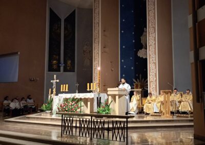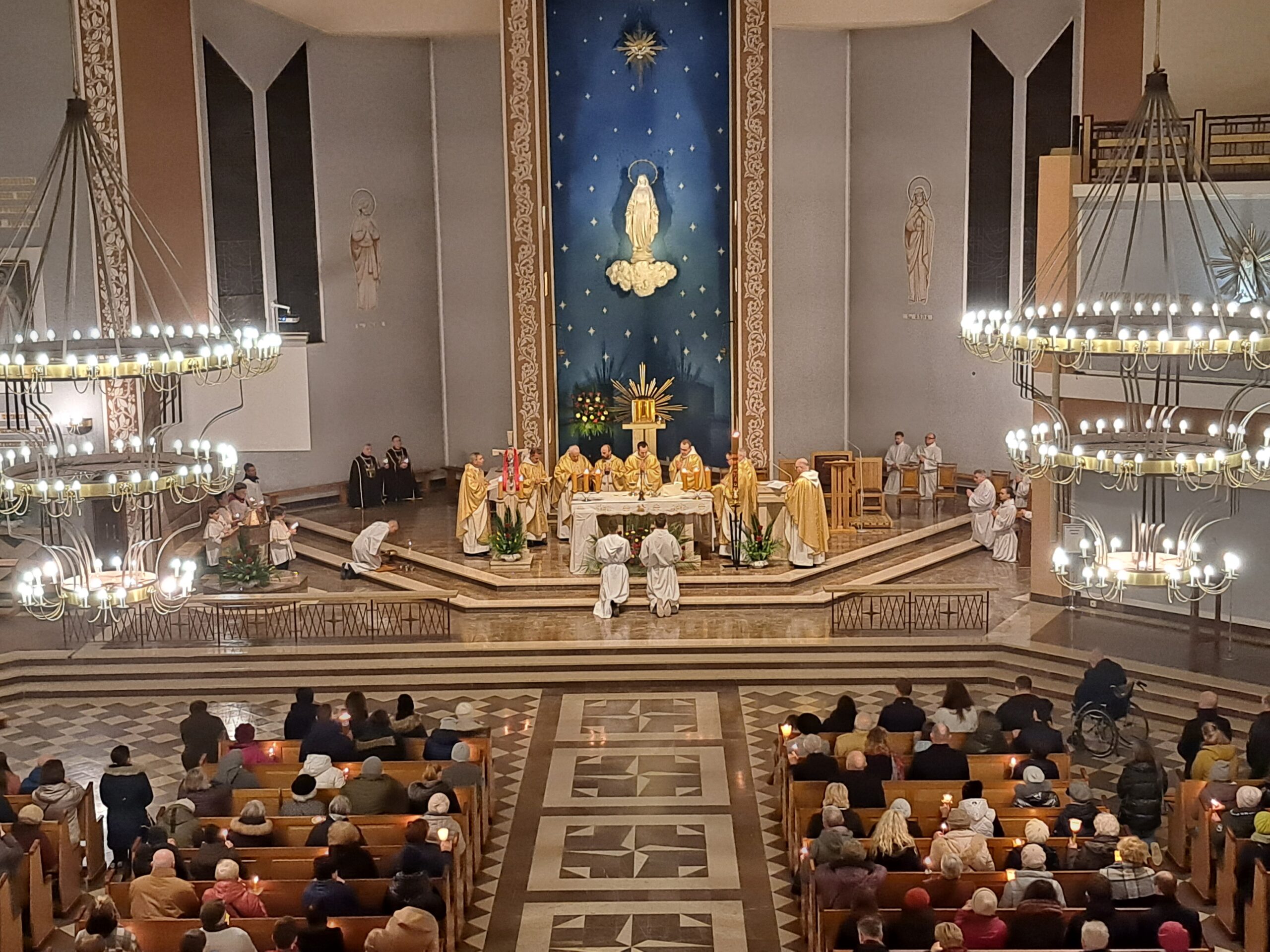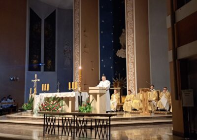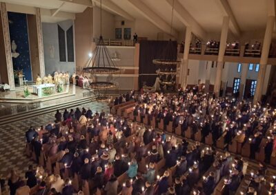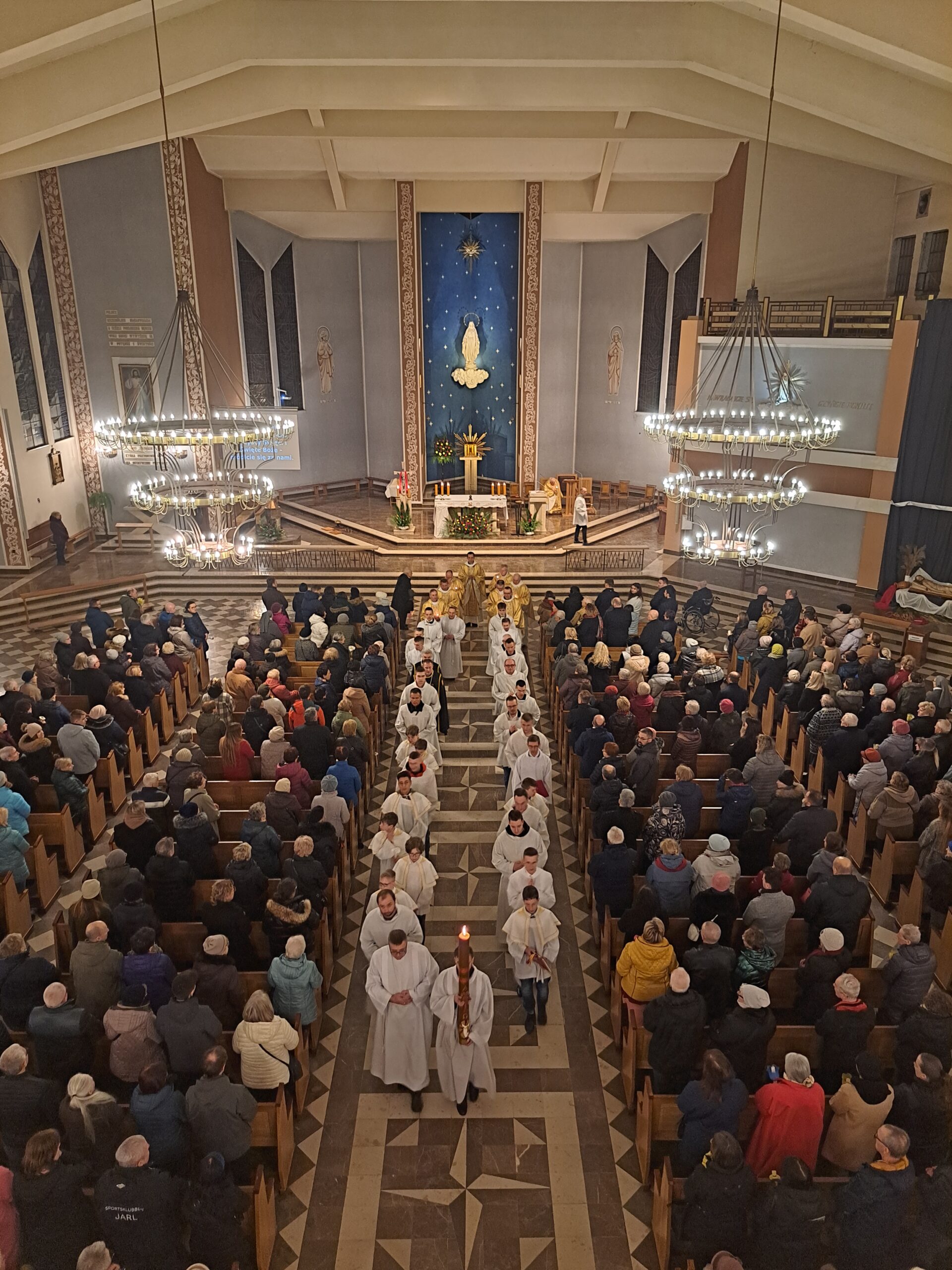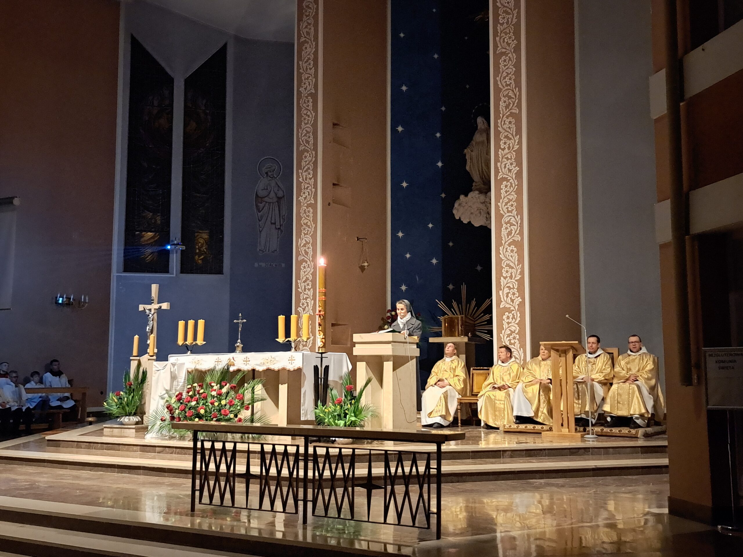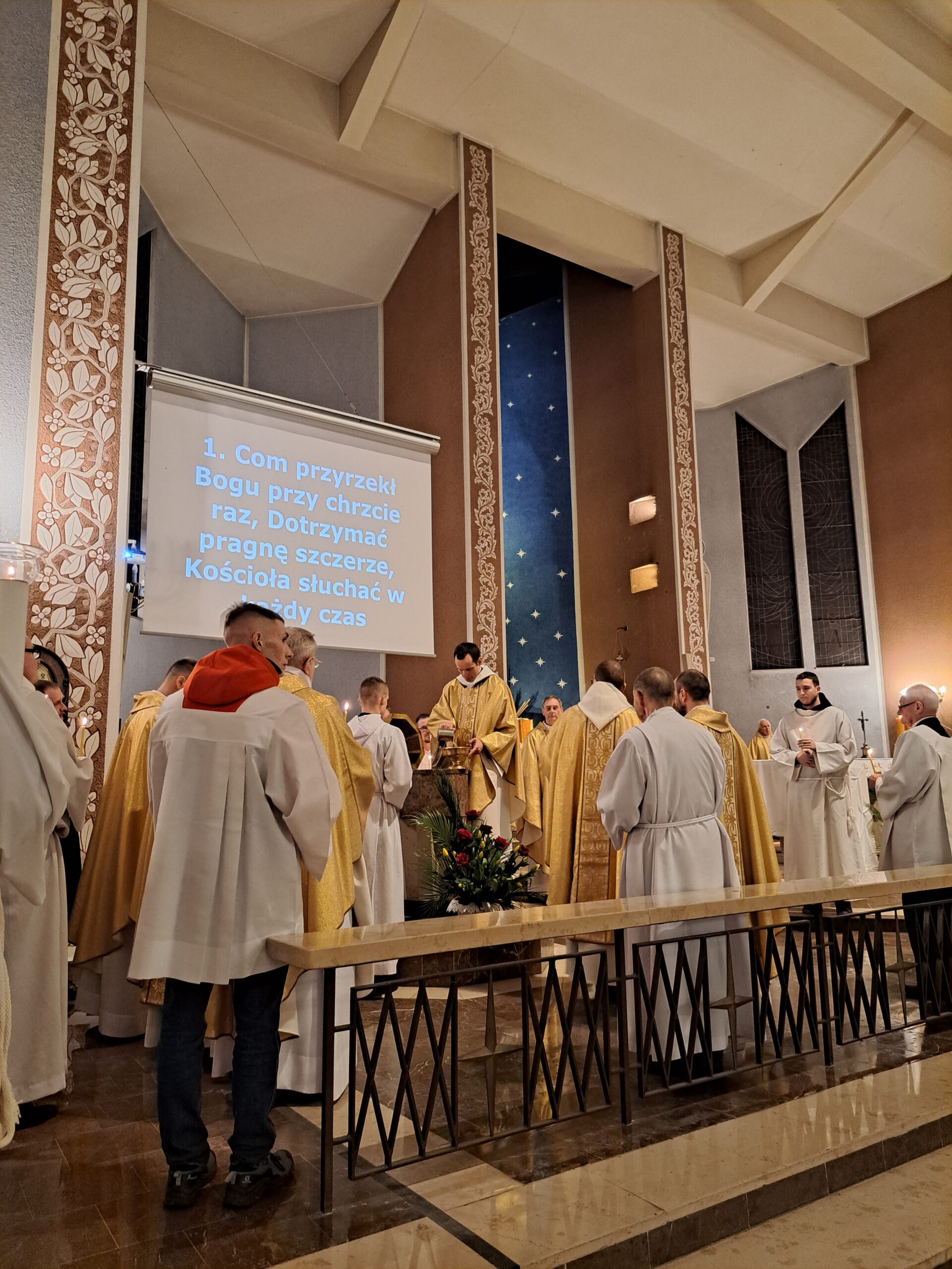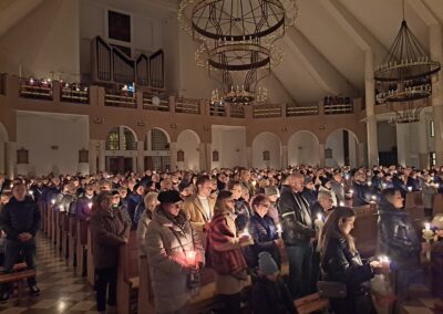 Liturgia Wigilii Paschalnej rozpoczęła się o godz. 20.00 obrzędem światła, czyli poświęceniem ognia w parafialnym ogrodzie. Liturgii przewodniczył ks. Mikołaj Dobosz, który po zapaleniu Paschału, uroczyście wniósł go do kościoła z trzykrotnym oznajmieniem: Światło Chrystusa. Wierni zapalając świece od Paschału wypełnili kościół Jego blaskiem. Szczególnie bogata w tym dniu Liturgia Słowa przypomniała o najważniejszych momentach historii zbawienia. Po uroczystym odśpiewaniu Chwała na wysokości Bogu, wysłuchaliśmy Ewangelii o odkryciu przez niewiasty pustego grobu Chrystusa. Po homilii miało miejsce poświęcenie wody chrzcielnej, poprzez zanurzenie Paschału, który uroczystą procesją został przyniesiony do chrzcielnicy. Wierni, ponownie otoczeni Światłem Chrystusa, mogli odnowić przyrzeczenia Sakramentu Chrztu Świętego. Chór parafialny wzbogacił całą Liturgię uroczystym śpiewem pieśni głoszących Zmartwychwstanie. Ostatnim elementem Liturgii była procesja Zmartwychwstania, dzięki której Dobra Nowina niosła się po całej okolicy przez śpiew wiernych – Alleluja!