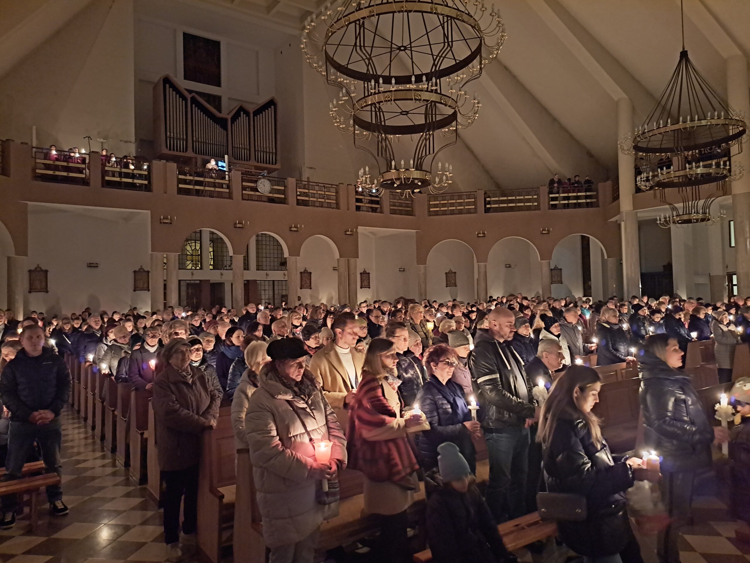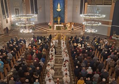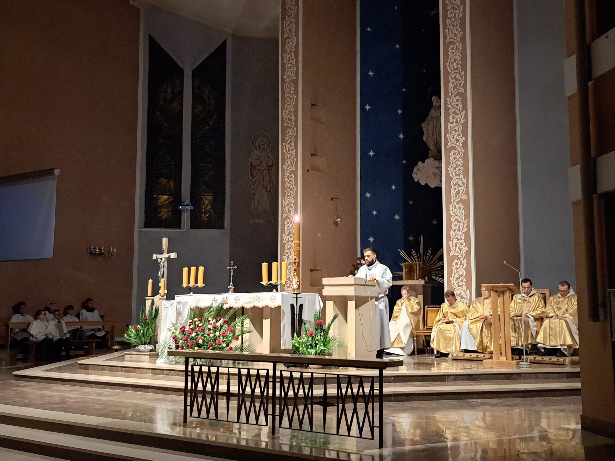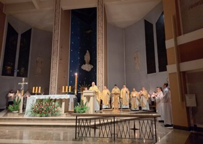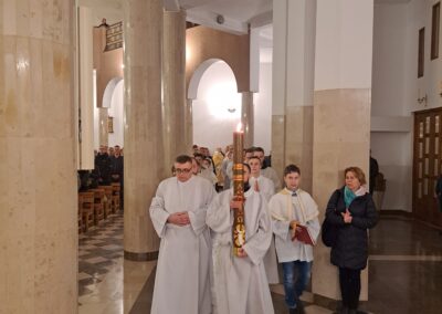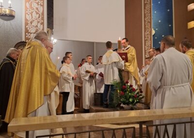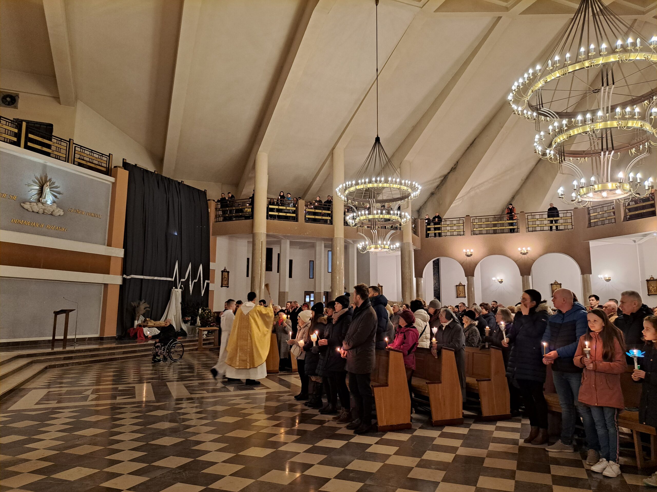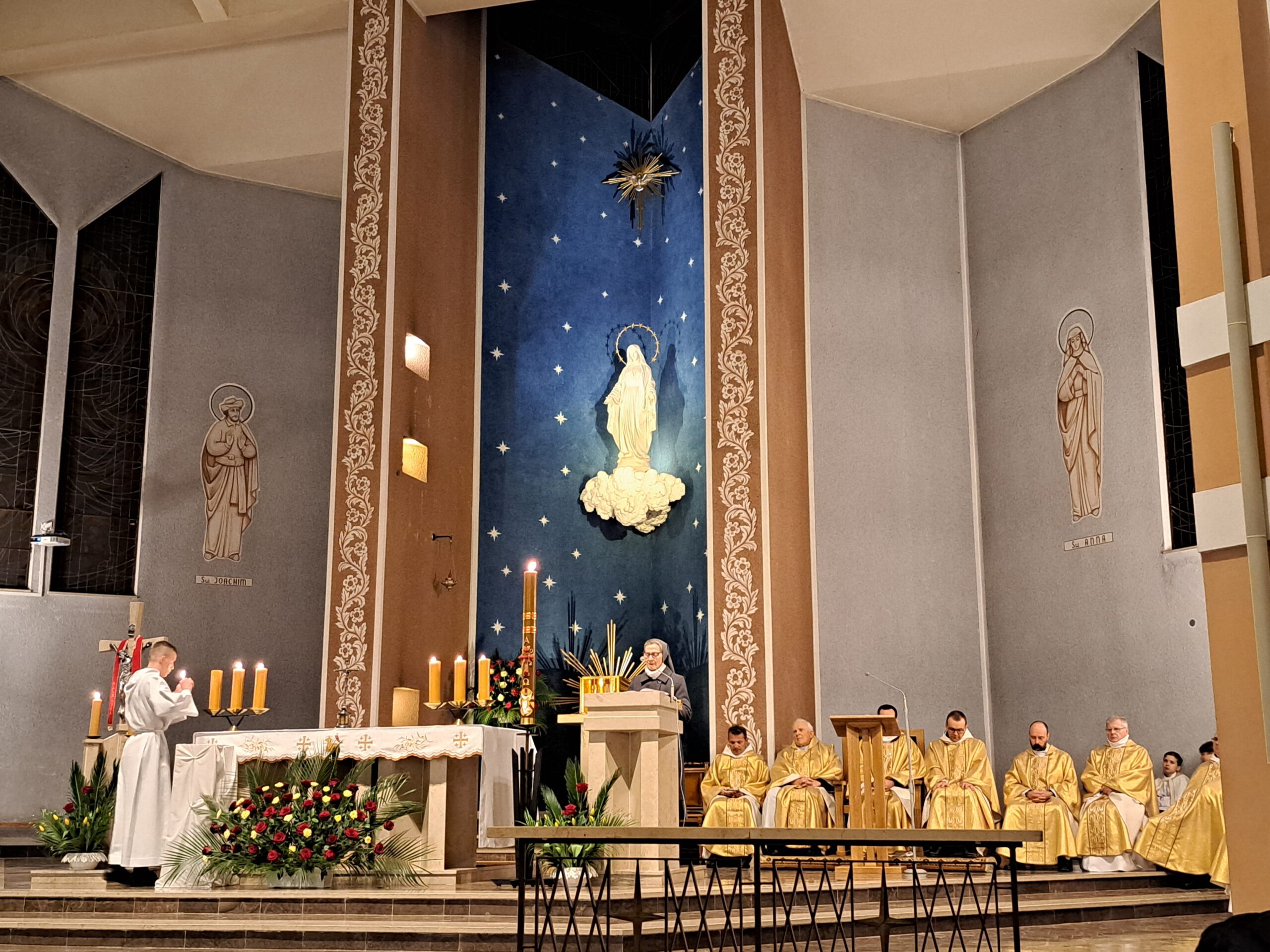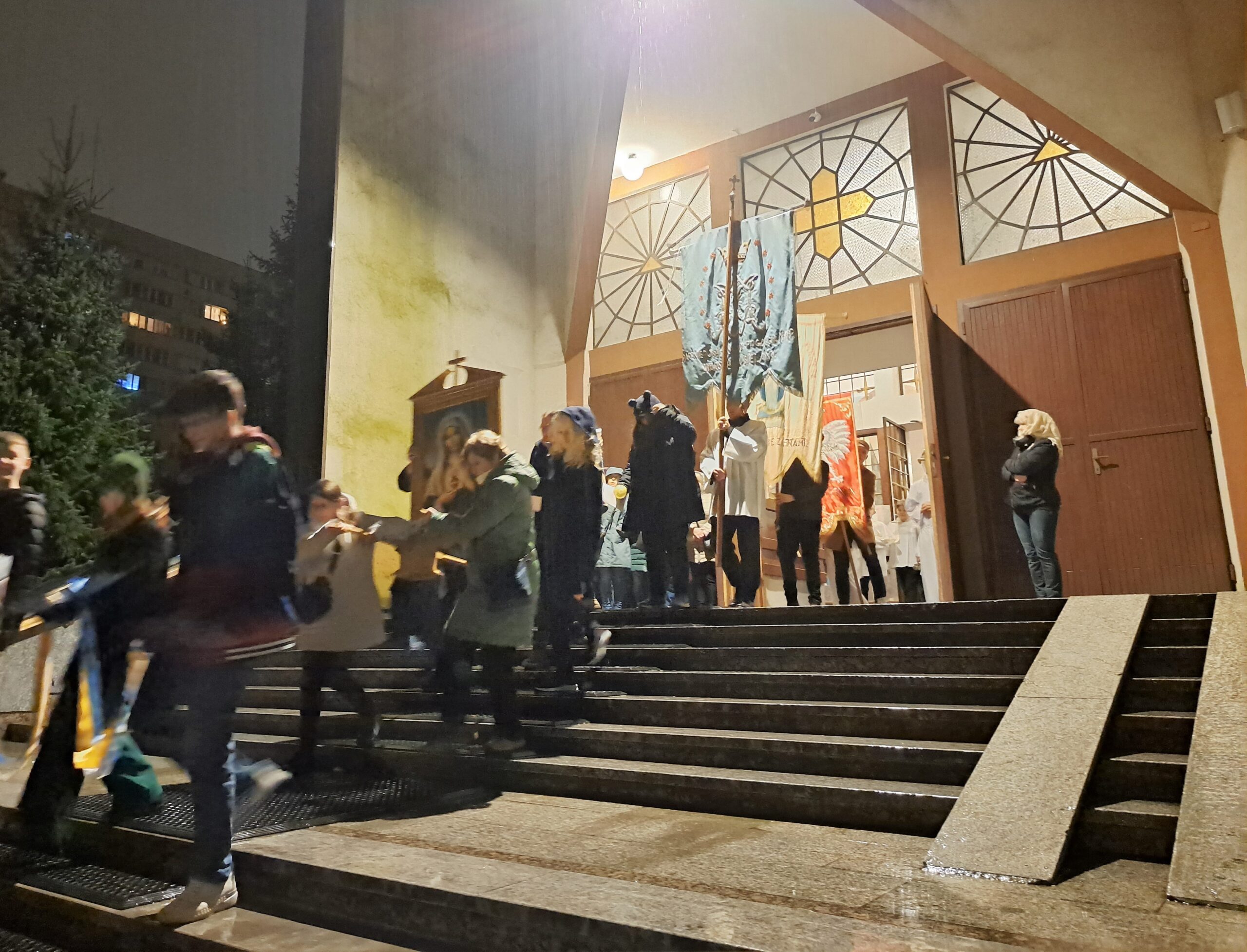 Liturgia Wigilii Paschalnej rozpoczęła się o godz. 20.00 obrzędem światła, czyli poświęceniem ognia w parafialnym ogrodzie. Liturgii przewodniczył ks. Mikołaj Dobosz, który po zapaleniu Paschału, uroczyście wniósł go do kościoła z trzykrotnym oznajmieniem: Światło Chrystusa. Wierni zapalając świece od Paschału wypełnili kościół Jego blaskiem. Szczególnie bogata w tym dniu Liturgia Słowa przypomniała o najważniejszych momentach historii zbawienia. Po uroczystym odśpiewaniu Chwała na wysokości Bogu, wysłuchaliśmy Ewangelii o odkryciu przez niewiasty pustego grobu Chrystusa. Po homilii miało miejsce poświęcenie wody chrzcielnej, poprzez zanurzenie Paschału, który uroczystą procesją został przyniesiony do chrzcielnicy. Wierni, ponownie otoczeni Światłem Chrystusa, mogli odnowić przyrzeczenia Sakramentu Chrztu Świętego. Chór parafialny wzbogacił całą Liturgię uroczystym śpiewem pieśni głoszących Zmartwychwstanie. Ostatnim elementem Liturgii była procesja Zmartwychwstania, dzięki której Dobra Nowina niosła się po całej okolicy przez śpiew wiernych – Alleluja!