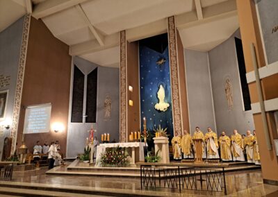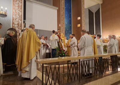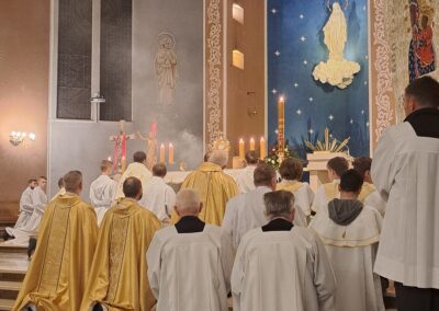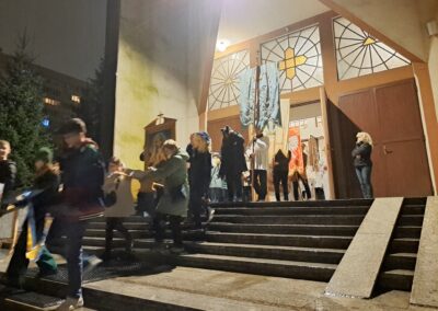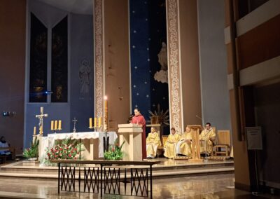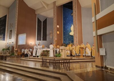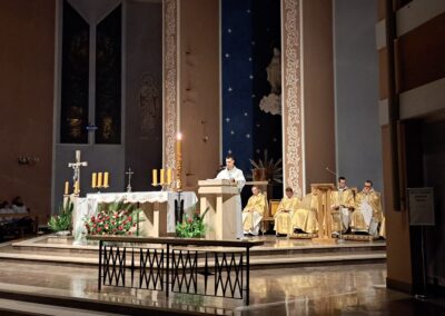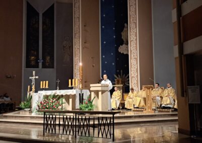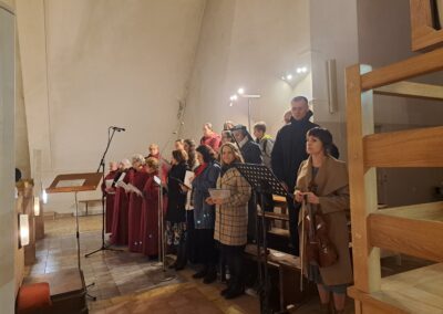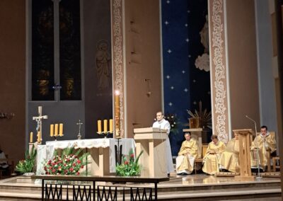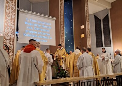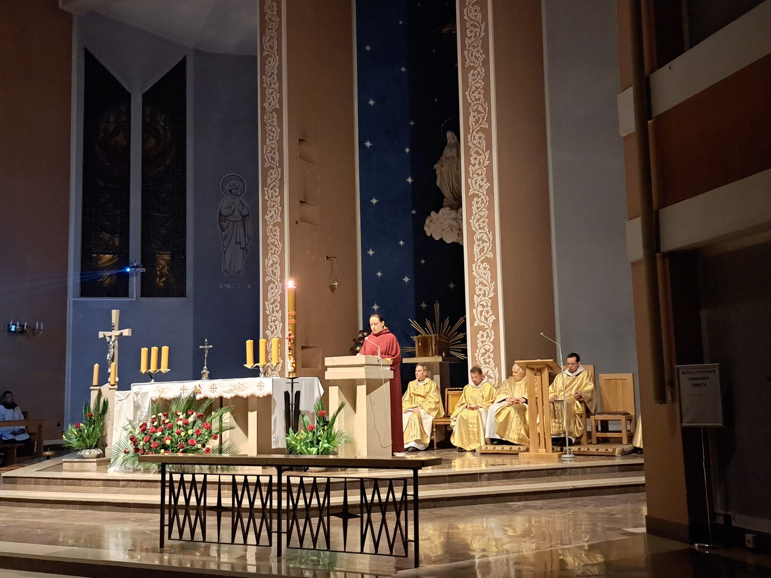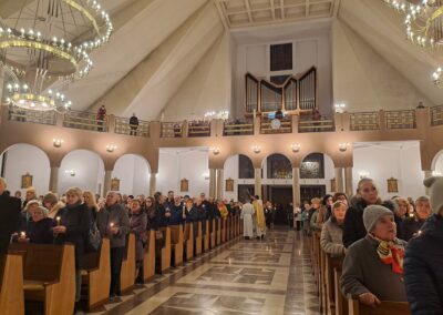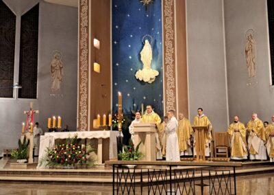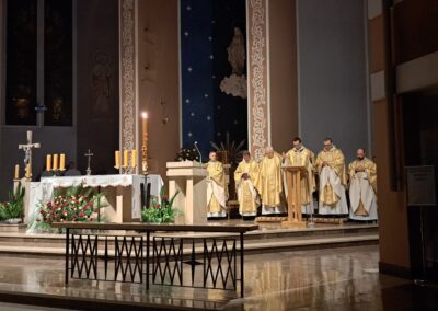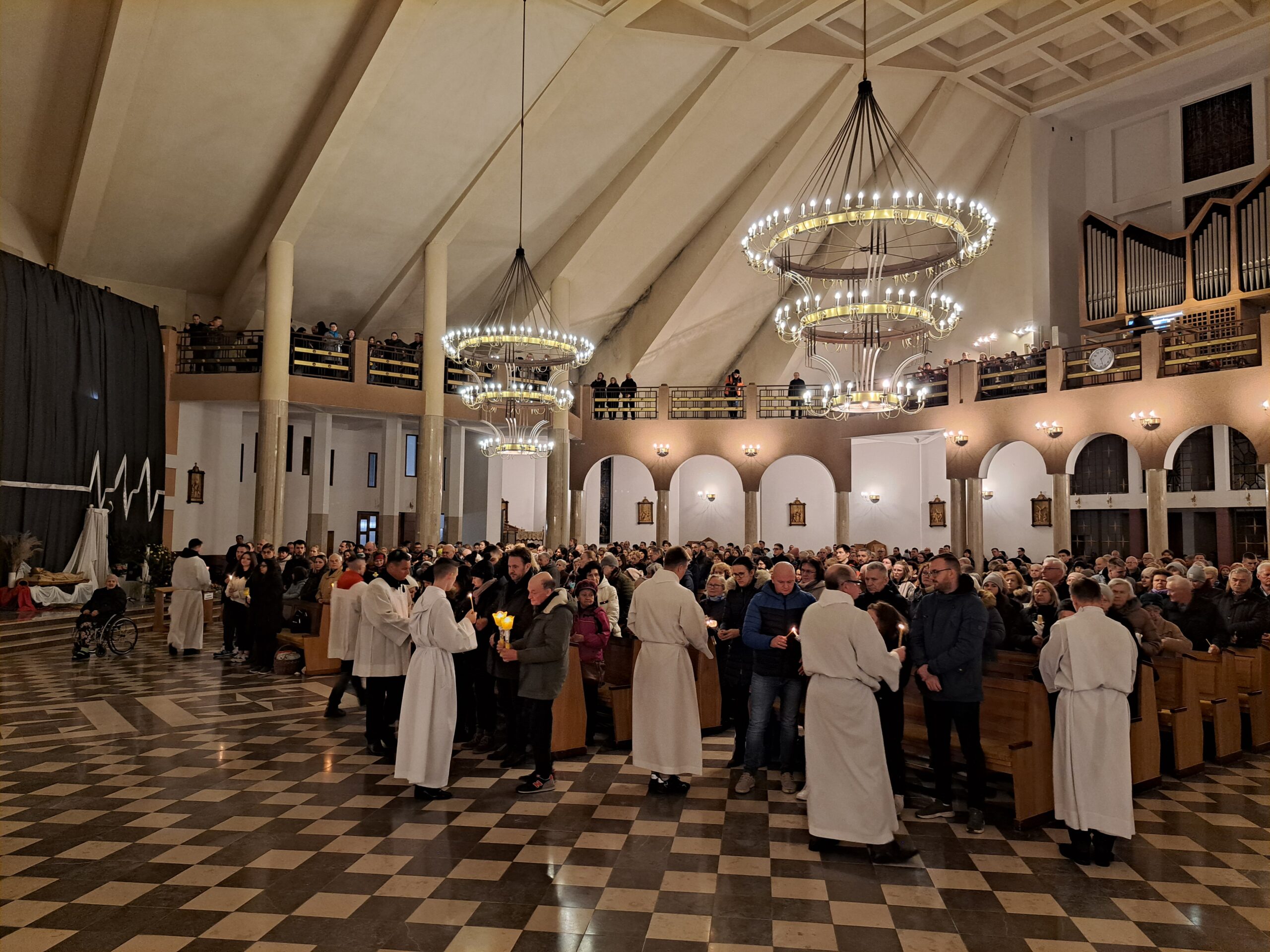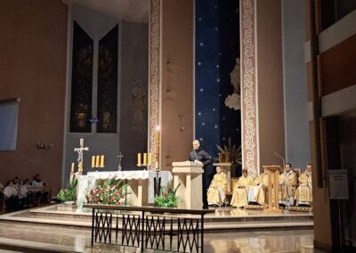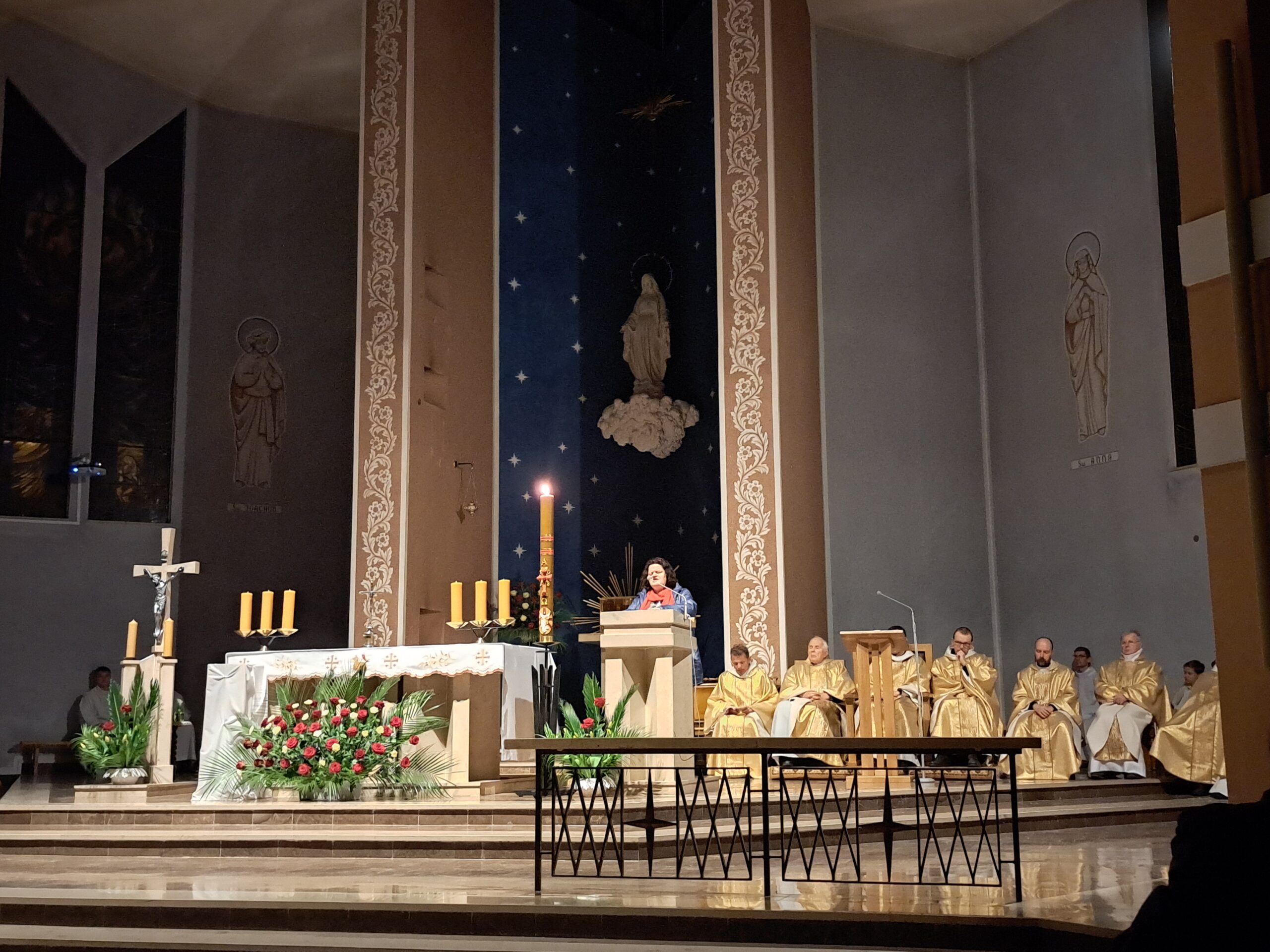 Liturgia Wigilii Paschalnej rozpoczęła się o godz. 20.00 obrzędem światła, czyli poświęceniem ognia w parafialnym ogrodzie. Liturgii przewodniczył ks. Mikołaj Dobosz, który po zapaleniu Paschału, uroczyście wniósł go do kościoła z trzykrotnym oznajmieniem: Światło Chrystusa. Wierni zapalając świece od Paschału wypełnili kościół Jego blaskiem. Szczególnie bogata w tym dniu Liturgia Słowa przypomniała o najważniejszych momentach historii zbawienia. Po uroczystym odśpiewaniu Chwała na wysokości Bogu, wysłuchaliśmy Ewangelii o odkryciu przez niewiasty pustego grobu Chrystusa. Po homilii miało miejsce poświęcenie wody chrzcielnej, poprzez zanurzenie Paschału, który uroczystą procesją został przyniesiony do chrzcielnicy. Wierni, ponownie otoczeni Światłem Chrystusa, mogli odnowić przyrzeczenia Sakramentu Chrztu Świętego. Chór parafialny wzbogacił całą Liturgię uroczystym śpiewem pieśni głoszących Zmartwychwstanie. Ostatnim elementem Liturgii była procesja Zmartwychwstania, dzięki której Dobra Nowina niosła się po całej okolicy przez śpiew wiernych – Alleluja!
