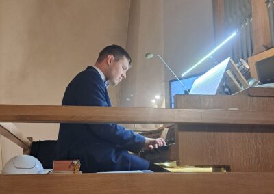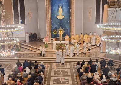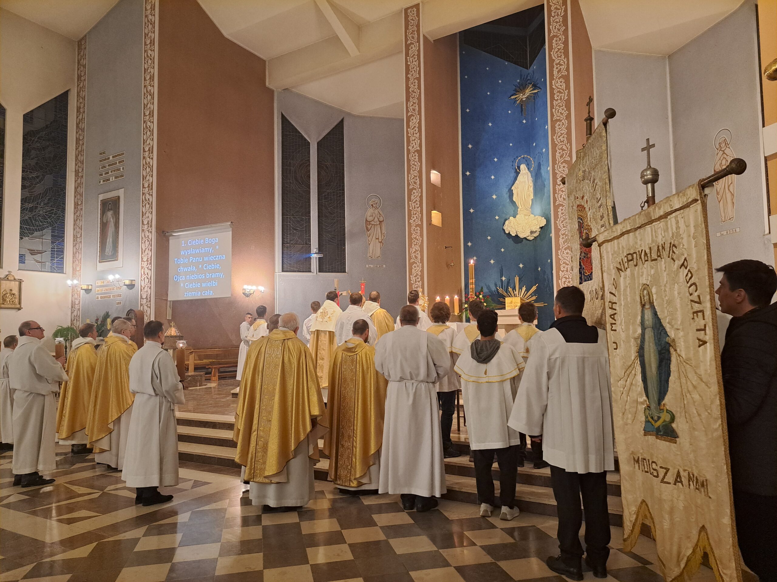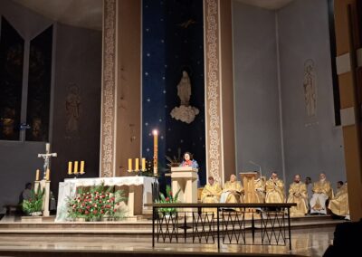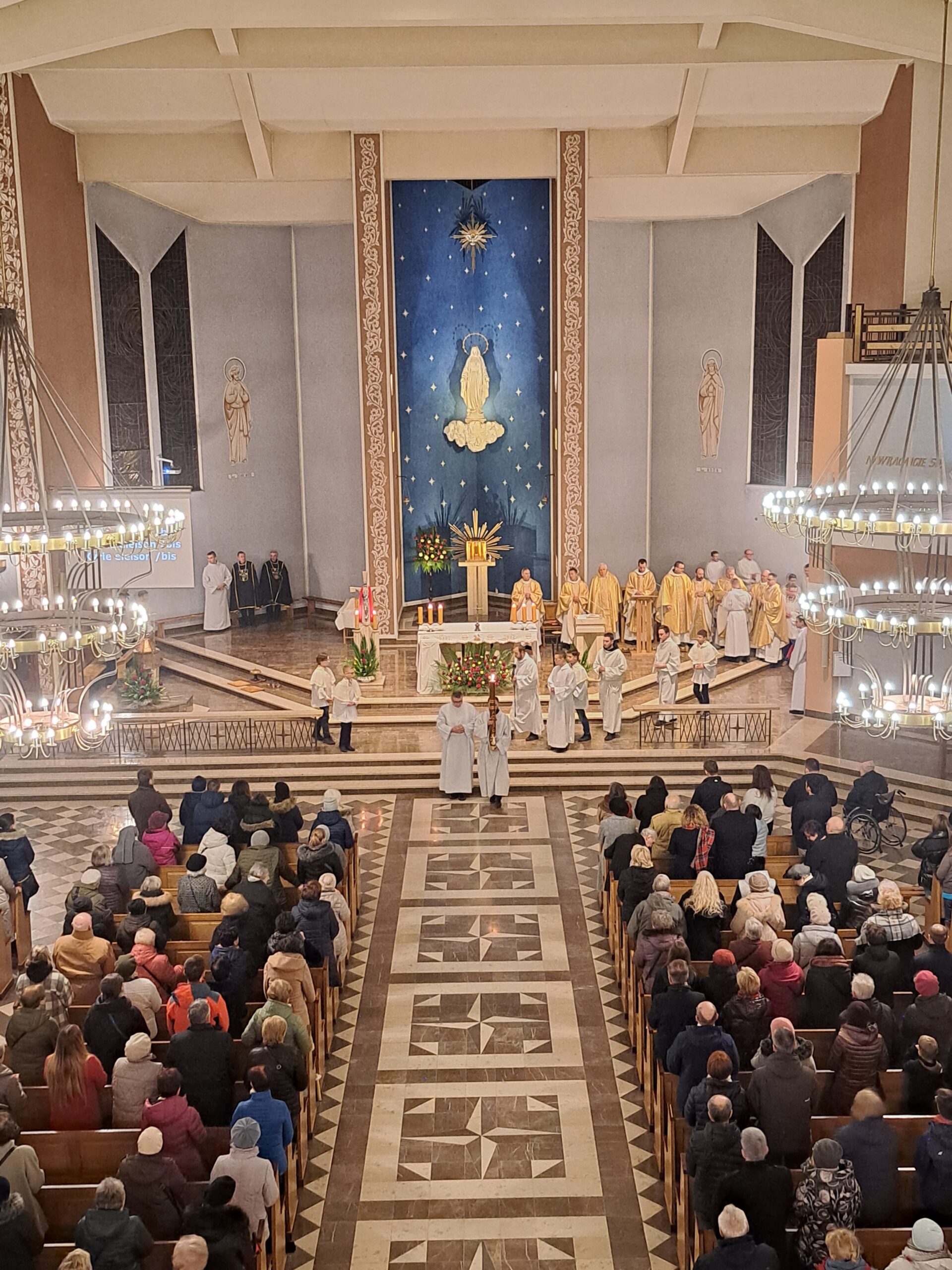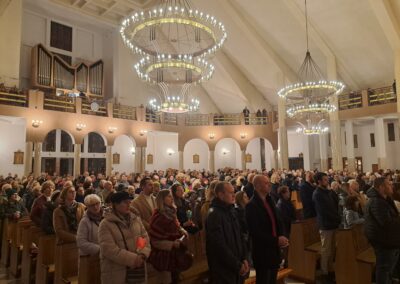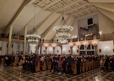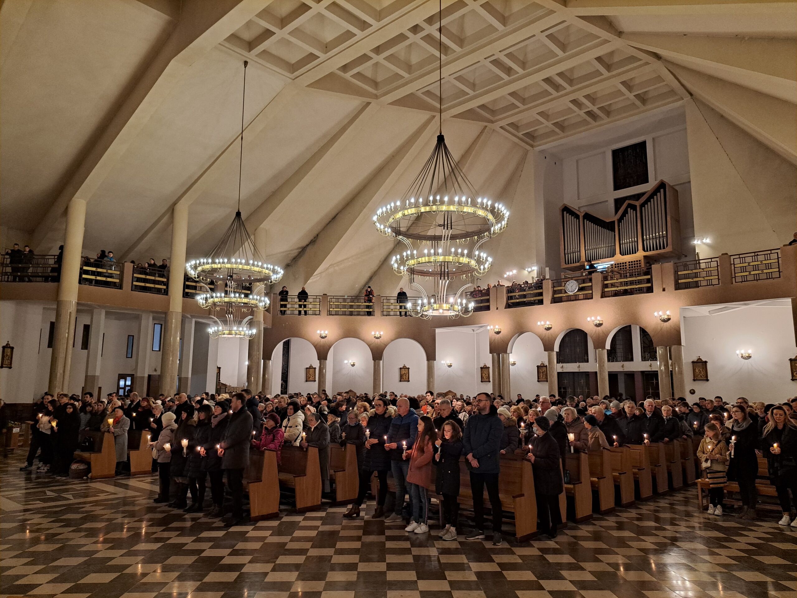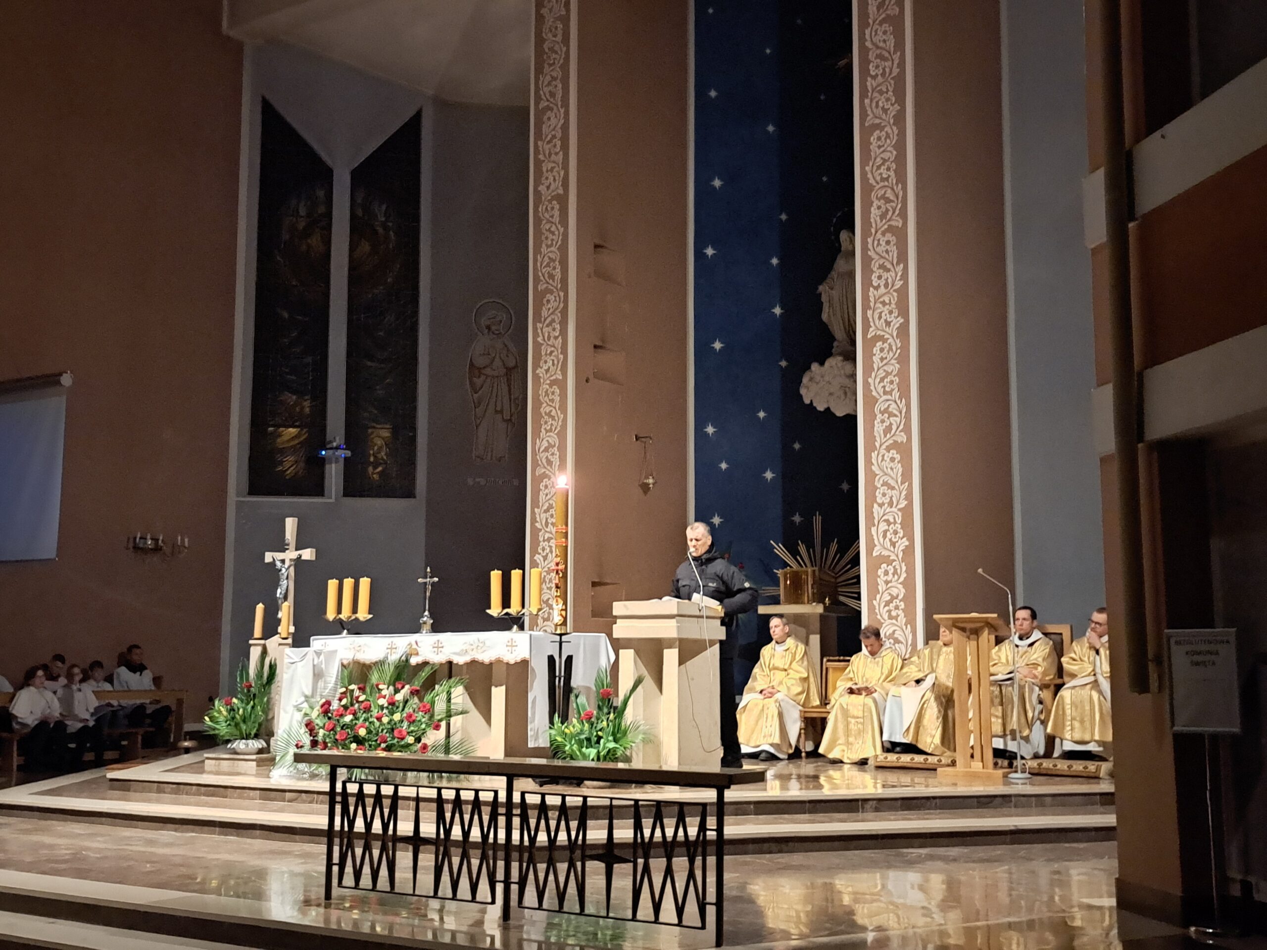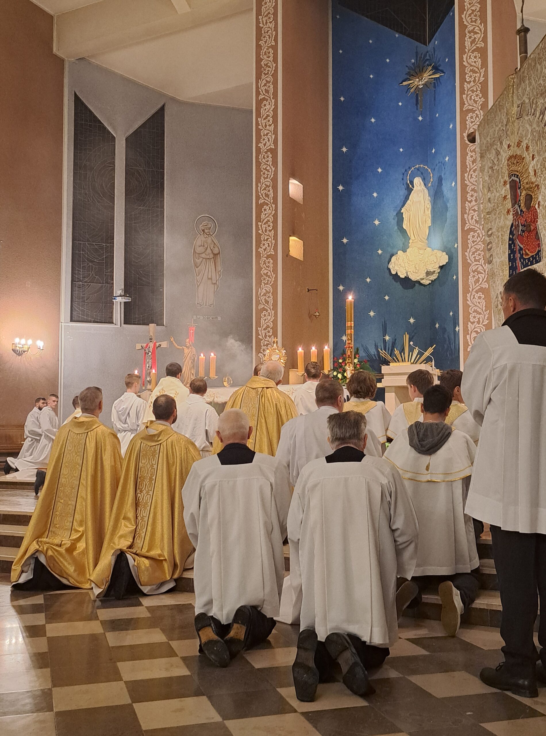 Liturgia Wigilii Paschalnej rozpoczęła się o godz. 20.00 obrzędem światła, czyli poświęceniem ognia w parafialnym ogrodzie. Liturgii przewodniczył ks. Mikołaj Dobosz, który po zapaleniu Paschału, uroczyście wniósł go do kościoła z trzykrotnym oznajmieniem: Światło Chrystusa. Wierni zapalając świece od Paschału wypełnili kościół Jego blaskiem. Szczególnie bogata w tym dniu Liturgia Słowa przypomniała o najważniejszych momentach historii zbawienia. Po uroczystym odśpiewaniu Chwała na wysokości Bogu, wysłuchaliśmy Ewangelii o odkryciu przez niewiasty pustego grobu Chrystusa. Po homilii miało miejsce poświęcenie wody chrzcielnej, poprzez zanurzenie Paschału, który uroczystą procesją został przyniesiony do chrzcielnicy. Wierni, ponownie otoczeni Światłem Chrystusa, mogli odnowić przyrzeczenia Sakramentu Chrztu Świętego. Chór parafialny wzbogacił całą Liturgię uroczystym śpiewem pieśni głoszących Zmartwychwstanie. Ostatnim elementem Liturgii była procesja Zmartwychwstania, dzięki której Dobra Nowina niosła się po całej okolicy przez śpiew wiernych – Alleluja!