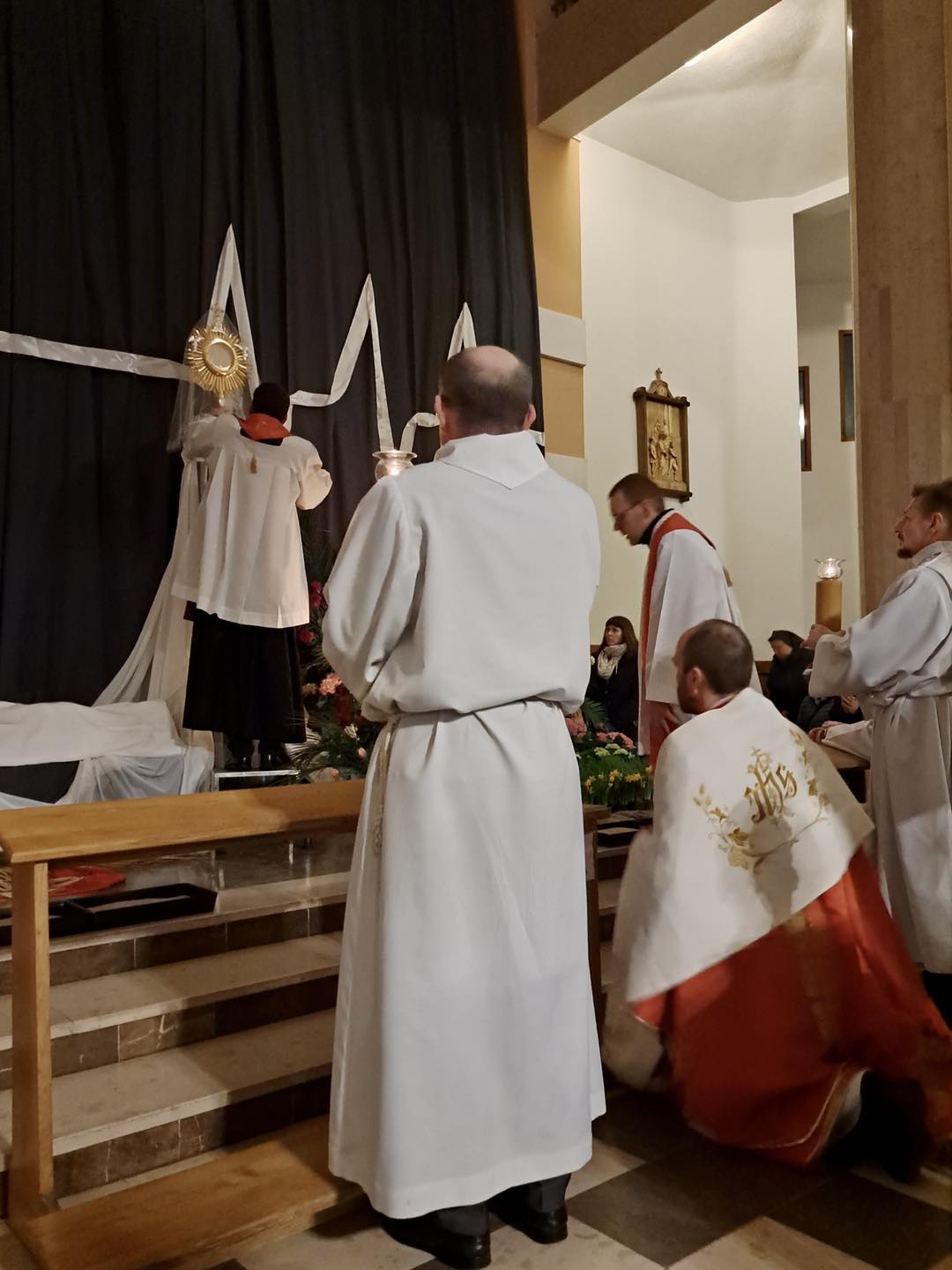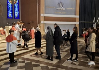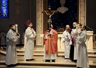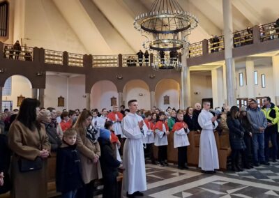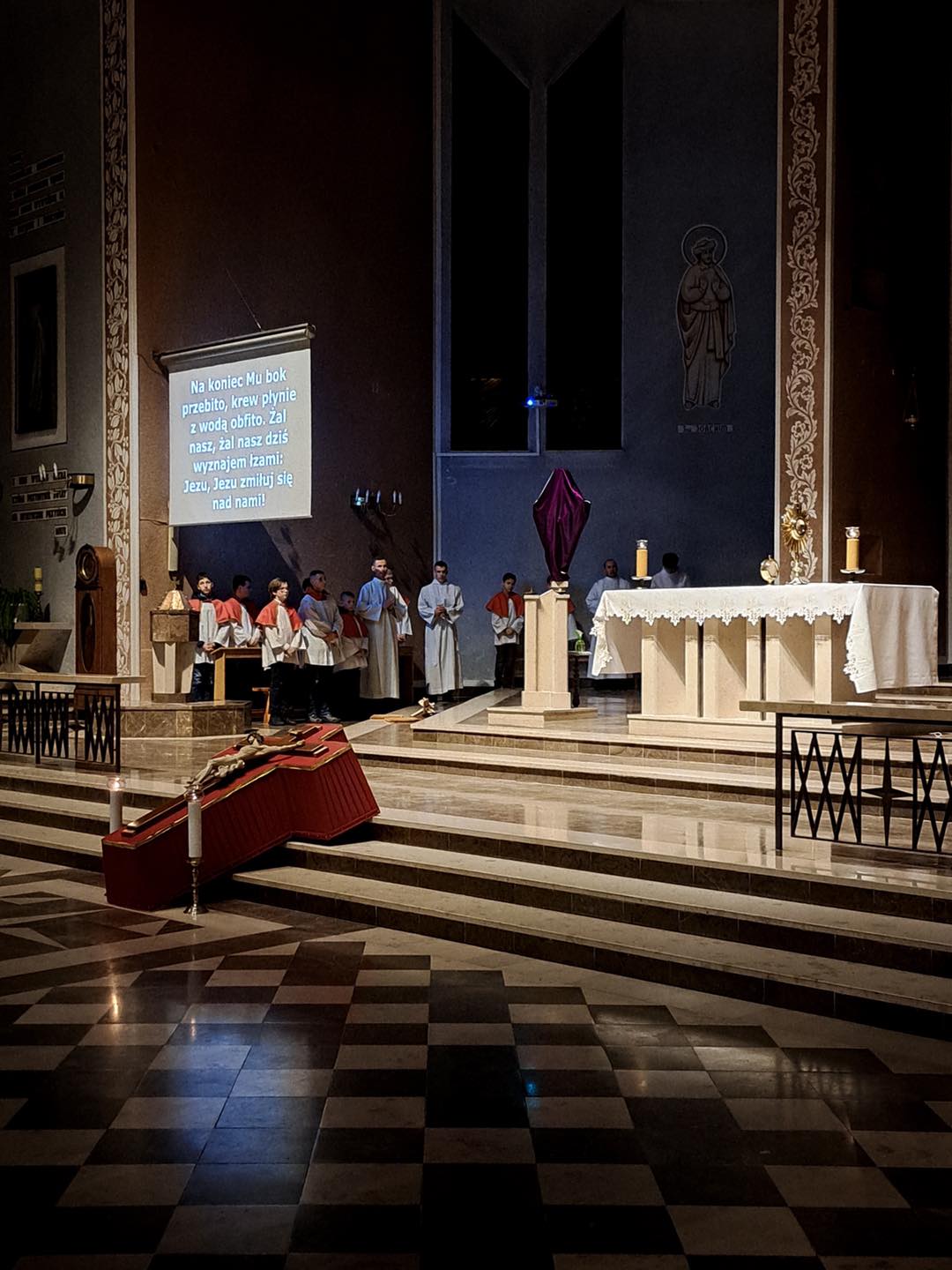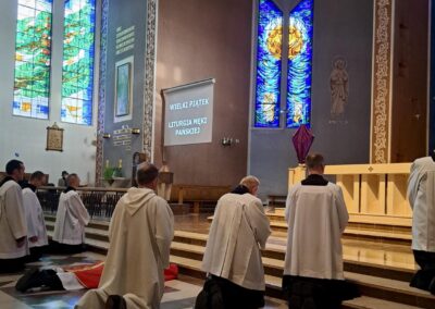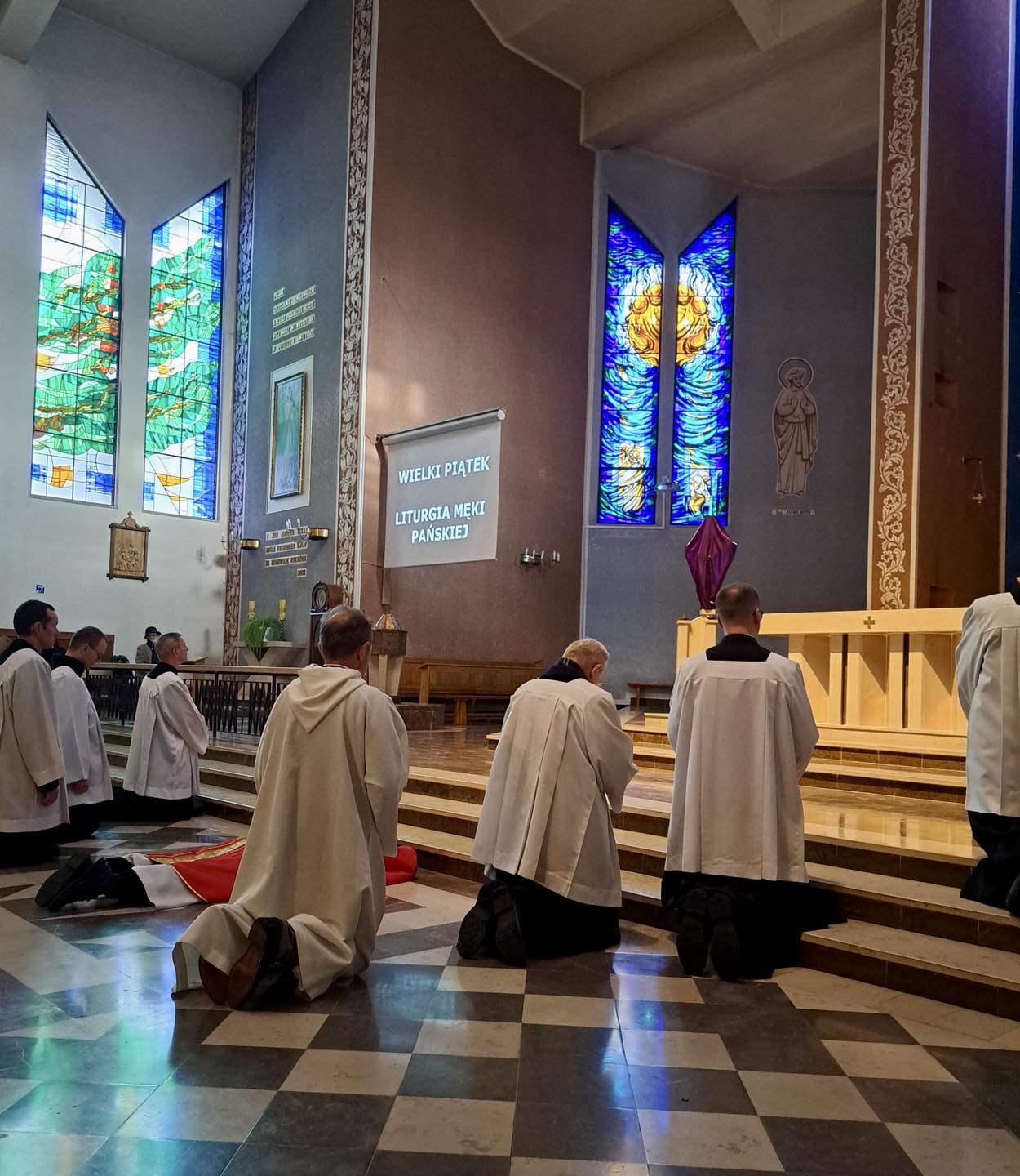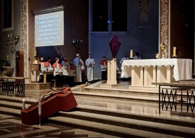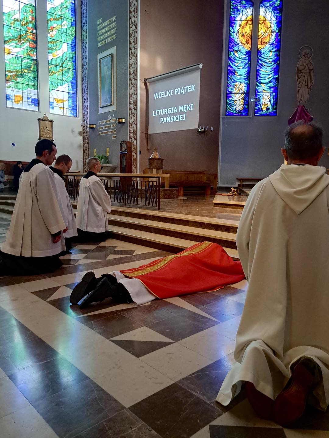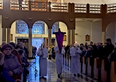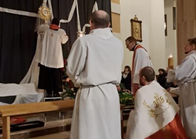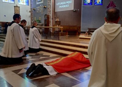 Liturgię Męki Pańskiej rozpoczęła procesja wejścia, której w tym dniu nie towarzyszył śpiew. Przewodniczący Liturgii ks. Damian Drozd sprawował ją w szatach koloru czerwonego, który w tym przypadku jest nie tyle kolorem męczeństwa, a bardziej królewskiej purpury. Jest to znak królewskiej godności Chrystusa, zwycięstwa nad śmiercią, które przychodzi do nas przez krzyż. Bardzo wymownym gestem jest prostracja głównego celebransa (łac. prostratio – padnięcie całym ciałem na ziemię). Wyraża on kondycję pierwszego człowieka i ból Kościoła. Punktem kulminacyjnym Liturgii Wielkiego Piątku jest adoracja Krzyża, do której przystąpili licznie zgromadzeni Parafianie, oddając cześć „drzewu krzyża, na którym zawisło zbawienie świata”. Ostatnim elementem Liturgii Męki Pańskiej była procesja do Grobu Pańskiego, przy którym wierni mogli adorować Krzyż i Najświętszy Sakrament przez całą noc.