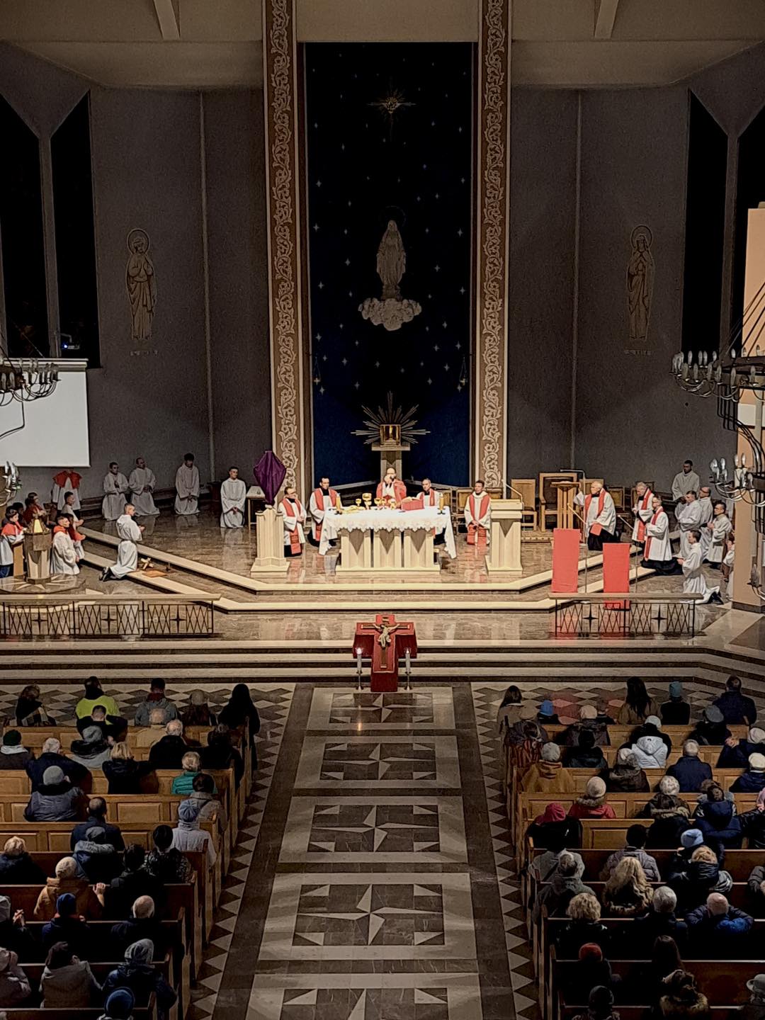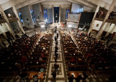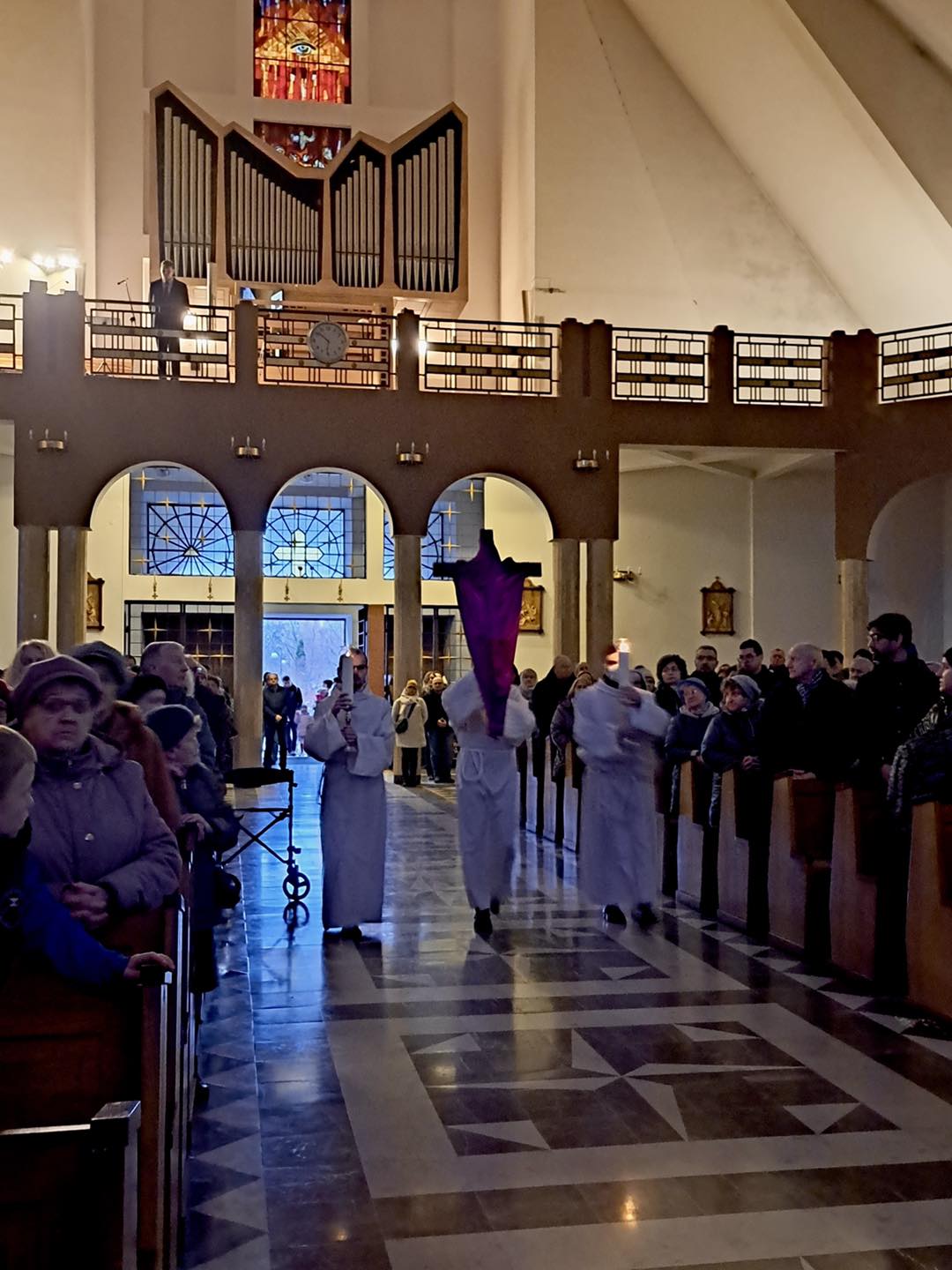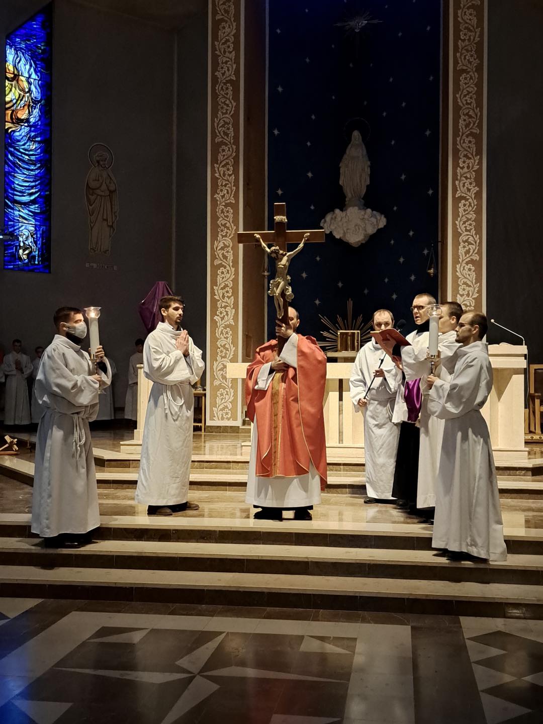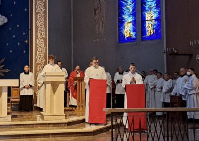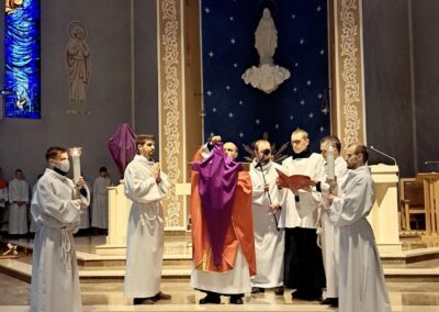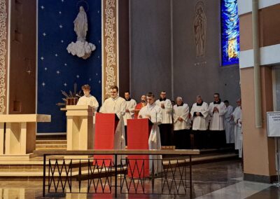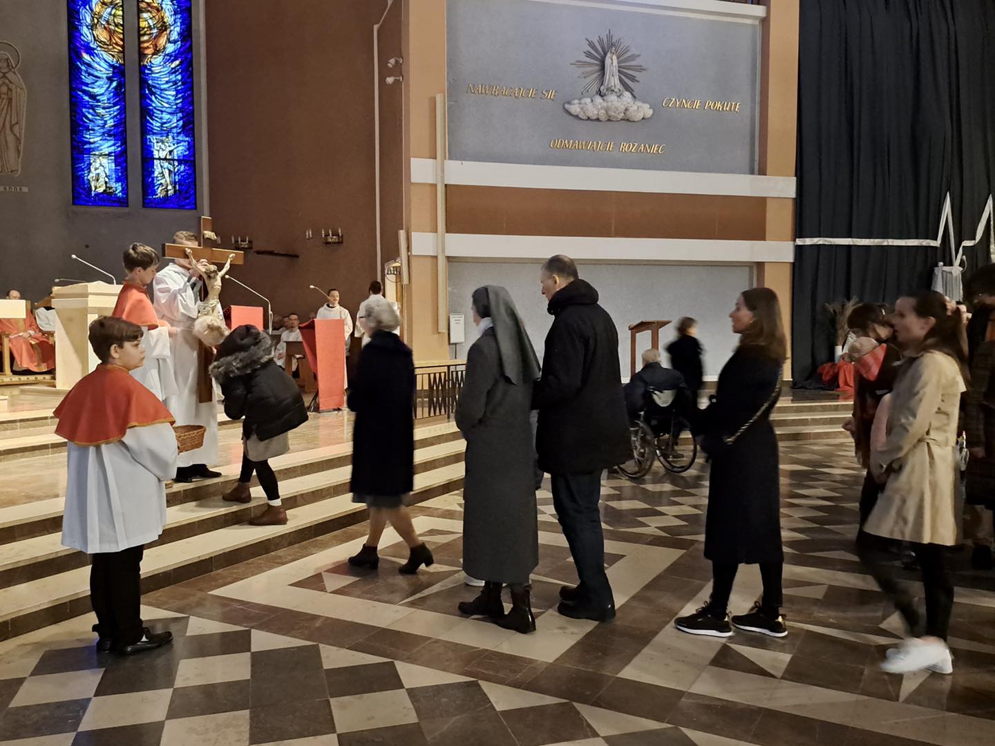 Liturgię Męki Pańskiej rozpoczęła procesja wejścia, której w tym dniu nie towarzyszył śpiew. Przewodniczący Liturgii ks. Damian Drozd sprawował ją w szatach koloru czerwonego, który w tym przypadku jest nie tyle kolorem męczeństwa, a bardziej królewskiej purpury. Jest to znak królewskiej godności Chrystusa, zwycięstwa nad śmiercią, które przychodzi do nas przez krzyż. Bardzo wymownym gestem jest prostracja głównego celebransa (łac. prostratio – padnięcie całym ciałem na ziemię). Wyraża on kondycję pierwszego człowieka i ból Kościoła. Punktem kulminacyjnym Liturgii Wielkiego Piątku jest adoracja Krzyża, do której przystąpili licznie zgromadzeni Parafianie, oddając cześć „drzewu krzyża, na którym zawisło zbawienie świata”. Ostatnim elementem Liturgii Męki Pańskiej była procesja do Grobu Pańskiego, przy którym wierni mogli adorować Krzyż i Najświętszy Sakrament przez całą noc.
